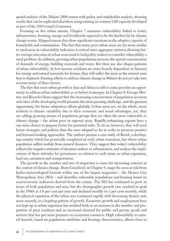 spatial analysis of the Malawi 2008 census with policy and stakeholder analysis, showing results that can be replicated elsewhere using existing in-country GIS capacity developed as part of the 2010 round of censuses. Focusing on five urban extents, Chapter 7 examines vulnerability linked to water, infrastructure, housing, energy and livelihoods expected to be the hardest hit by climate change events. Mapped census data show significant variations in the adaptive capacity of households and communities. The fact that many poor urban areas are far more similar to rural areas in vulnerability indicators is critical since aggregate statistics showing better average outcomes in urban areas tend to lead policy makers to consider vulnerability a rural problem. In addition, growing urban populations increase the spatial concentration of demands of energy, building materials and water. But their use also shapes patterns of urban vulnerability: As low-income residents are more heavily dependent on biomass for energy and natural materials for houses, they will suffer the most as the natural asset base is depleted. Existing efforts to address climate change in Malawi do not yet take into account many of these factors. The fact that most urban growth in Asia and Africa is still to come provides an opportunity to address urban vulnerability as or before it emerges. In Chapter 8, George Martine and Ricardo Ojima suggest that the increasing concentration of population in towns and cities of the developing world presents the most pressing challenge, and the greatest opportunity, for future adaptation efforts globally. Urban areas are, on the whole, more resilient to climate variability due to their economic and social advantages, yet, they are adding growing masses of population groups that are often the most vulnerable to climate change – the urban poor in exposed areas. Rapidly-urbanizing regions have a one-time chance to prepare better for potential risks. To do so, however, they will need better strategies and policies than the ones adopted so far in order to promote positive and forward-looking approaches. The authors present a case study of Brazil, a developing country which has practically completed an early urban transition, but whose urban population suffers unduly from natural disasters. They suggest that today’s vulnerability reflects the negative attitudes of decision-makers to urbanization, and analyze the implications of these attitudes for governance in relation to such issues as urban expansion, land use, sanitation and transportation. The growth in the number and size of megacities is cause for increasing concern in the context of climate change. Boris Graizbord, in Chapter 9, maps the areas at risk from hydro-meteorological hazards within one of the largest megacities – the Mexico City Metropolitan Area (MA) – and identifies vulnerable populations and housing based on socioeconomic indicators derived from the census. The MA has continued to grow in terms of both population and area, but the demographic growth rate reached its peak in the 1960s at 3.6 per cent per year and declined steadily to 1 per cent recently, while the physical expansion of the urban area continued rapidly with decreasing density and, more recently, in a leapfrog pattern of growth. Economic growth and employment have not kept up as urban expansion has resulted both in an increase in the number and proportion of poor residents and an increased demand for public and private goods and services that has put more pressure on ecosystem resources. High vulnerability to natural hazards, based on population attributes and housing characteristics, affects close to xx
