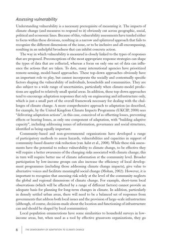 Assessing vulnerability Understanding vulnerability is a necessary prerequisite of measuring it. The impacts of climate change (and measures to respond to it) obviously cut across geographic, social, political and economic lines. Because of this, vulnerability assessments have tended either to focus within these divisions, resulting in a narrow and splintered approach that fails to recognize the different dimensions of the issue, or to be inclusive and all-encompassing, resulting in an unhelpful broadness that can inhibit concrete action. The way in which vulnerability is measured is closely linked to the types of responses that are proposed. Preconceptions of the most appropriate response strategies can shape the types of data that are collected, whereas a focus on only one set of data can influence the actions that are taken. To date, many international agencies have prioritized remote-sensing, model-based approaches. These top-down approaches obviously have an important role to play, but cannot incorporate the socially and contextually specific factors shaping the vulnerability of individuals, households and communities. They are also subject to a wide range of uncertainties, particularly when climate-model predictions are applied to relatively small spatial areas. In addition, these top-down approaches tend to encourage adaptation responses that rely on engineering and infrastructure only, which is just a small part of the overall framework necessary for dealing with the challenges of climate change. A more comprehensive approach to adaptation (as described, for example, by the United Kingdom Climate Impacts Programme (UKCIP, 2008) sees “delivering adaptation actions”, in this case, conceived of as offsetting losses, preventing effects or bearing losses, as only one component of adaptation, with “building adaptive capacity”, including addressing issues of information, governance and social structures, identified as being equally important. Community-based and non-governmental organizations have developed a range of participatory methods to assess hazards, vulnerabilities and capacities in support of community-based disaster risk reduction (van Aalst et al., 2008). While these risk assessments have the potential to reduce vulnerability to climate change, to be effective they will require a better awareness of the changing risks associated with climate change; this in turn will require better use of climate information at the community level. Broader participation by low-income groups can also increase the efficiency of local development programmes (including those addressing climate change impacts), give value to alternative voices and facilitate meaningful social change (Mohan, 2002). However, it is important to recognize that assessing risk solely at the level of the community neglects the global and regional dimensions of climate change. For example, short-term local observations (which will be affected by a range of different factors) cannot provide an adequate basis for planning for long-term changes in climate. In addition, particularly in densely settled urban areas, there will need to be a balanced set of responses from governments that address both local issues and the provision of large-scale infrastructure (although, of course, decisions made about the location and functioning of infrastructure can and should be shaped by local communities). Local population enumerations have some similarities to household surveys in lowincome areas, but, when used as a tool by effective grassroots organizations, they go 8