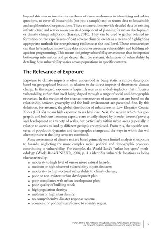 The Relevance of Exposure Exposure to climate impacts is often understood as being static: a simple description based on geographical location in relation to the direct impacts of disasters or climate change. In this regard, exposure is frequently seen as an underlying factor that influences vulnerability, rather than itself being shaped through a range of social and demographic processes. In this section of the chapter, perspectives of exposure that are based on the relationship between geography and the built environment are presented first. By this definition, for instance, the global distribution of urban areas in Low Elevation Coastal Zones (LECZs) means high exposure to sea level rise. Next, the ways in which this geographic and built environment exposure are actually shaped by broader issues of poverty and development at a variety of scales, but particularly within urban areas (especially in relation to access to land by different groups), are explored. From this, the specific concerns of population dynamics and demographic change and the ways in which this will alter exposure in the long term are examined. Many assessments of climate risk are based primarily on a limited analysis of exposure to hazards, neglecting the more complex social, political and demographic processes contributing to vulnerability. For example, the World Bank’s “urban hot spots” methodology (World Bank/UNISDR, 2008, p. 41) identifies vulnerable locations as being characterized by: • moderate to high level of one or more natural hazards; • medium or high observed vulnerability in past disasters; • moderate- to high-sectoral vulnerability to climate change; • poor or non-existent urban development plan; • poor compliance with urban development plan; • poor quality of building stock; • high population density; • medium or high slum density; • no comprehensive disaster response system; • economic or political significance to country region.