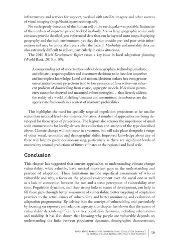 infrastructure and services for support, overlaid with satellite imagery and other sources of visual imaging (http://haiti.openstreetmap.nl/). No such speedy detection of the human toll of the earthquake was possible. Estimates of the numbers of impacted people trickled in slowly. Across large geographic scales, only censuses provide detailed, geo-referenced data that can be layered onto maps displaying geography and the built environment, yet they do not provide pre- and post-crisis information and may be undertaken years after the hazard. Morbidity and mortality data are also extremely difficult to collect, particularly in crisis situations. The 2010 World Development Report raises a key issue in local adaptation planning (World Bank, 2010, p. 89): A compounding set of uncertainties—about demographics, technology, markets, and climate—requires policies and investment decisions to be based on imperfect and incomplete knowledge. Local and national decision makers face even greater uncertainties because projections tend to lose precision at finer scales—an inherent problem of downscaling from coarse, aggregate models. If decision parameters cannot be observed and measured, robust strategies . . . that directly address the reality of a world of shifting baselines and intermittent disturbances are the appropriate framework in a context of unknown probabilities. This highlights the need for spatially targeted population projections at far smaller scales than national level – for instance, for cities. A number of approaches are being developed for these types of projections. The Report also stresses the importance of small scale enumerations for locally-driven data collection and analysis of the type described above. Climate change will not occur in a vacuum, but will take place alongside a range of other social, economic and demographic shifts. Improved knowledge about any of these will help to guide decision-making, particularly as there are significant levels of uncertainty around predictions of future climates at the regional and local scale.