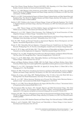 Asian Cities Climate Change Resilience Network (ACCCRN). 2009. Responding to the Urban Climate Challenge. Boulder, Colorado: Institute for Social and Environmental Transition. Balk, D., et al. 2009.“Mapping Urban Settlements and the Risks of Climate Change in Africa, Asia and South America” Pp. 80-103 in: Population Dynamics and Climate Change, edited by J. M. Guzmán, et al. 2009. New York and London : UNFPA and IIED. Balk, D., et al. 2009. “Understanding the Impacts of Climate Change: Linking Sattelite and Other Spatial Data with Population Data.” Pp. 206-217 in: Population Dynamics and Climate Change, edited by J. M. Guzmán, et al. 2009. New York and London: UNFPA andIIED. Bartlett, S. 2009. “Children in the Context of Climate Change: A Large and Vulnerable Population.” Pp. 133-148 in: Population Dynamics and Climate Change edited by J. M. Guzmán, et al. 2009. New York and London: UNFPA and IIED. ________. 2008. “Climate Change and Urban Children: Impacts and Implications for Adaptation in Low- and Middle-income Countries.” Environment and Urbanization 20(2): 501-519. Birkmann, J., et al. 2010. “Adaptive Urban Governance: New Challenges for the Second Generation of Urban Adaptation Strategies to Climate Change.” Sustainability Science 5(2): 185-206. Birkmann, J., and K. von Teichma. 2010. “Integrating Disaster Risk Reduction and Climate Change Adaptation: Key Challenges: Scales, Knowledge, and Norms.” Sustainability Science 5(2): 171-184. Boyd, M. 1989. “Family and Personal Networks in International Migration: Recent Developments and New Agendas.’ International Migration Review 23(3): 638-670. Brooks, N. 2003. Vulnerability, Risk and Adaptation: A Conceptual Framework. Tyndall Centre for Climate Change Research. Working Paper No, 38. Norwich, United Kingdom: Tyndall Centre for Climate Change Research. Brooks, N., W. N. Adger, and P. M. Kelly. 2005. “‘The Determinants of Vulnerability and Adaptive Capacity at the National Level and the Implications for Adaptation.” Global Environmental Change 15(2): 151-163. Browning, C. R., et al. 2006. “Neighborhood Social Processes, Physical Conditions, and Disaster-Related Mortality: The Case of the 1995 Chicago Heat Wave.” American Sociological Review 71(4): 661-678. Cannon, T., and D. Müller-Mahn. 2010. :Vulnerability, Resilience and Development Discourses in Context of Climate Change.” Natural Hazards 55(3): 621-635. Climate and Disaster Resilience Initiative (CDRI). 2009. City Profile: Climate and Disaster Resilience. Kyoto: Kyoto University. Website: http://www.unisdr.org/files/8168_cityprofilelowresolution.pdf, last accessed 25 October 2012. Dickson, E., et al. 2012. Understanding Urban Risk: An Approach for Assessing Disaster & Climate Risk in Cities. Washington, D. C.: The World Bank. Dodman, D. 2009. “Urban Form, Greenhouse Gas Emissions and Climate Vulnerability. Pp. 64-79 in: Population Dynamics and Climate Change, edited by J. M Guzmán, et al. 2009. New York and London: UNFPA and IIED. Dodman, D., J. Ayers, and S. Huq. 2009. “Building Resilience.” Pp. 151-168 in: State of the World 2009: Into a Warming World. The World Watch Institute. New York: W. W. Norton and Company. Elder, K., et al. 2007. “African Americans’ Decisions not to Evacuate New Orleans before Hurricane Katrina: a qualitative study.” American Journal of Public Health 97(Supplement 1): S124-S129. Fouillet, A., et al. 2006. “Excess Mortality Related to the August 2003 Heat Wave in France.” International Archives of Occupational and Environmental Health 80(1): 16-24. The Government Office for Science. 2011. Foresight: Migration and Global Environmental Change. 2011: Final Project Report. London: The Government Office for Science. Website: www.bis.gov.uk/assets/foresight/docs/ migration/11-1116-migration-and-global-environmental-change.pdf, last accessed 25 October 2012. Guzmán, J M. 2009. “‘The Use of Population Census Data for Environmental and Climate Change Analysis.” Pp. 192-205 in: Population Dynamics and Climate Change, edited by J. M. Guzmán, et al. 2009. New York and London: UNFPA and IIED. Guzmán J. M., et al. (eds.) 2009. Population Dynamics and Climate Change. New York and London: UNFPA and IIED. Hardoy, J., and G. Pandiella. 2009. “Urban Poverty and Vulnerability to Climate Change in Latin America.” Environment and Urbanization 21(1): 203–224.