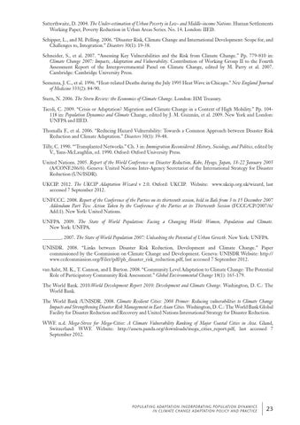 Satterthwaite, D. 2004. The Under-estimation of Urban Poverty in Low- and Middle-income Nations. Human Settlements Working Paper, Poverty Reduction in Urban Areas Series. No. 14. London: IIED. Schipper, L., and M. Pelling. 2006. “Disaster Risk, Climate Change and International Development: Scope for, and Challenges to, Integration.” Disasters 30(1): 19-38. Schneider, S., et al. 2007. “Assessing Key Vulnerabilities and the Risk from Climate Change.” Pp. 779-810 in: Climate Change 2007: Impacts, Adaptation and Vulnerability. Contribution of Working Group II to the Fourth Assessment Report of the Intergovernmental Panel on Climate Change, edited by M. Parry et al. 2007. Cambridge: Cambridge University Press. Semenza, J. C., et al. 1996. “Heat-related Deaths during the July 1995 Heat Wave in Chicago.” New England Journal of Medicine 335(2): 84-90. Stern, N. 2006. The Stern Review: the Economics of Climate Change. London: HM Treasury. Tacoli, C. 2009. “Crisis or Adaptation? Migration and Climate Change in a Context of High Mobility.” Pp. 104118 in: Population Dynamics and Climate Change, edited by J. M. Guzmán, et al. 2009. New York and London: UNFPA and IIED. Thomalla F., et al. 2006. “Reducing Hazard Vulnerability: Towards a Common Approach between Disaster Risk Reduction and Climate Adaptation.” Disasters 30(1): 39-48. Tilly, C. 1990. “‘Transplanted Networks.” Ch. 3 in: Immigration Reconsidered: History, Sociology, and Politics, edited by V., Yans-McLaughlin, ed. 1990. Oxford: Oxford University Press. United Nations. 2005. Report of the World Conference on Disaster Reduction, Kobe, Hyogo, Japan, 18-22 January 2005 (A/CONF.206/6). Geneva: United Nations Inter-Agency Secretariat of the International Strategy for Disaster Reduction (UN/ISDR). UKCIP. 2012. The UKCIP Adaptation Wizard v 2.0. Oxford: UKCIP. Website: www.ukcip.org.uk/wizard, last accessed 7 September 2012. UNFCCC. 2008. Report of the Conference of the Parties on its thirteenth session, held in Bali from 3 to 15 December 2007 Addendum Part Two: Action Taken by the Conference of the Parties at its Thirteenth Session (FCCC/CP/2007/6/ Add.1). New York: United Nations. UNFPA. 2009. The State of World Population: Facing a Changing World: Women, Population and Climate. New York: UNFPA. ________. 2007. The State of World Population 2007: Unleashing the Potential of Urban Growth. New York: UNFPA. UNISDR. 2008. “Links between Disaster Risk Reduction, Development and Climate Change.” Paper commissioned by the Commission on Climate Change and Development. Geneva: UNISDR Website: http:// www.ccdcommission.org/Filer/pdf/pb_disaster_risk_reduction.pdf, last accessed 7 September 2012. van Aalst, M. K., T. Cannon, and I. Burton. 2008. “Community Level Adaptation to Climate Change: The Potential Role of Participatory Community Risk Assessment.” Global Environmental Change 18(1): 165-179. The World Bank. 2010.World Development Report 2010: Development and Climate Change. Washington, D. C.: The World Bank. The World Bank /UNISDR. 2008. Climate Resilient Cities: 2008 Primer: Reducing vulnerabilities to Climate Change Impacts and Strengthening Disaster Risk Management in East Asian Cities. Washington, D. C.: The World Bank Global Facility for Disaster Reduction and Recovery and United Nations International Strategy for Disaster Reduction. WWF. n.d. Mega-Stress for Mega-Cities: A Climate Vulnerability Ranking of Major Coastal Cities in Asia. Gland, Switzerland: WWF. Website: http://assets.panda.org/downloads/mega_cities_report.pdf, last accessed 7 September 2012.
