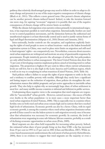 pathway that relatively disadvantaged groups may need to follow in order to adapt to climate change and presents it as one of the major negative consequences of climate change (Black et al., 2011). This reflects a more general issue: One person’s climate adaptation can be another person’s climate-induced hazard. Indeed, to take the iteration forward one more step, for aspiring “economic” migrants it is possible that one of the negative consequences of climate change will be stricter limits on mobility. While the climate-led migration crisis narrative relates primarily to international migration, it has important parallels in rural-urban migration. Internationally, borders are used to try to control population movements, and the distinction between the authorized and unauthorized migrant is at least rhetorically central and is used to justify various forms of legal and illegal discrimination (Adepoju et al., 2010; Donato and Armenta, 2011). Intra-nationally, border controls are the exception, and regulations explicitly limiting the rights of rural people to move to urban locations—such as the hukou household registration system in China, once used to place strict limits on migration and still used to limit migrants’ rights—are comparatively rare. Nevertheless, concerns about excessive rural-urban migration are widespread and motivate an array of questionable responses by governments. People intuitively perceive the advantages of urban life, but policymakers see only added burdens to urban management. The latest United Nations data show that 72 per cent of developing countries implement policies aimed at lowering rural-to-urban migration. The proportion is highest (81 per cent) in Africa where current urbanization levels are still low, but it is also high in the Latin America and Caribbean region, which is well on its way to completing its urban transition (United Nations, 2010, Table 16). Such policies reflect a failure to accept the rights of poor migrants to settle in the city and a tendency to conflate poverty with rurality. Although they rarely have a significant and lasting impact on the reduction of migration, these policies do strengthen the antiurbanization stances that inhibit pragmatic and pro-active approaches to inevitable urban growth. They also help to explain why an increasingly large share of urban settlement in most low- and many middle-income countries is informal and deficient in public services. Underpinning these negative views is the assumption that rural migrants are responsible for “uncontrolled” urban growth. However, natural increase—the excess of births over deaths in the urban population—is in most cases a more important factor than rural-urban migration (United Nations, 2008). This is especially true in countries where fertility rates in both rural and urban areas remain high and in nations that have reached high levels of urbanization. Economic growth can also be a factor. China, with its rapid economic growth, is among the countries where rural-urban migration dominates urban growth (China ceased to use the hukou system to curb migration severely once it became clear that urbanization was necessary for economic growth). In contrast, the levels of urbanization were stagnating in some sub-Saharan African countries, probably as a result of declining economic opportunities in urban areas (Potts, 2009). Rural migrants are also often held responsible for increasing urban poverty. Indeed, the estimated urban share of poor people living on less than US$1 a day has increased from 19 per cent in 1993 to 25 per cent in 2002 (Chen and Ravallion, 2007). While income-based measurements underestimate the real extent of urban poverty (Satterthwaite, 2004), there is no evidence to suggest that rural migrants are the majority or even a 26