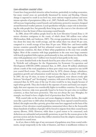 Low-elevation coastal cities Coasts have long provided attractive urban locations, particularly in trading economies, but many coastal areas are periodically threatened by storms and flooding. Climate change is expected to result in sea level rise, more extreme tropical cyclones and more intense episodes of precipitation (Alley et al., 2007; Nicholls and Cazenave, 2010). This will increase longstanding coastal hazards and undermine protective measures designed around historical weather patterns. Local specificities will play a major role in determining the risks people face, but generally those living near the coast at a low elevation will be likely to bear the brunt of these increasing coastal hazards. In 2000, about 630 million people lived in the Low Elevation Coastal Zone (< 10 meters elevation contiguous to the coast), of which about 360 million were urban (McGranahan, Balk, and Anderson, 2007). The average population density in this zone was about five times the world average, and the urban share was about 60 per cent, compared to a world average of less than 50 per cent. While low- and lower-middle income countries generally had less urbanized coastal zones than upper-middle and high-income countries, the share of their urban populations in the zone were actually higher. Most of the countries with large populations in the zone were large countries with heavily populated delta regions, predominantly in Asia, and almost two thirds of the cities with populations over 5 million were located at least partly in the zone. In a more detailed look at the hazards faced by port cities of over 1 million, a study by Nicholls and colleagues for the Organisation for Economic Co-operation and Development (OECD) (2008) estimated that, in 2005, about 40 million inhabitants (about a tenth of the total population in these port cities) were exposed to one-in100 year coastal flood events. They estimated that, by 2070, climate change, subsidence, population growth and urbanization would increase this figure to about 150 million. In 2005, the top 10 cities, in terms of exposed population, were almost evenly split between “developed” and “developing” countries, with most of the latter in Asia. They estimated that, by 2070, nine of the top 10 cities would be in Asia, largely because of rapid urban growth. They also looked at the exposure of assets and found, not surprisingly, that asset exposure was considerably higher in wealthier countries. For any given exposure, however, risks were generally found to be lower for port cities in wealthier countries, as these had more protection. This was not always the case: Shanghai, for example, was found to have a higher level of protection than New York. With coastal risks on the increase and ocean shipping in relative decline, this might seem like a good time to shift urban development away from exposed coastal locations. Indeed, this might seem like a priority, given that some have suggested on the basis of the estimates of low-elevation coastal population summarized above that in the foreseeable future hundreds of millions of people will be forced to migrate from their coastal homes anyway (Brown, 2010). However, while there is good reason to be concerned, such deductions are unfounded and potentially pernicious, in part for the reasons given in the previous section and also because they deflect attention from the adaptive measures that are needed in coastal areas. As of yet, there is little sign of any movement of population away from coastal settlements, except temporarily in the wake of disasters, and there is insufficient evidence to Fai r A n d E ffe ct i ve R e s po n s e s to U rban i zat i o n A n d C li m at e Ch a nge : Tap pi ng Sy n e rgi e s an d Avo i d i ng E xc lus i o nary P o li c i e s