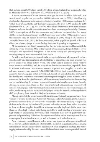 that, in Asia, about 0.54 billion out of 1.49 billion urban dwellers lived in drylands, while in Africa it is about 0.13 billion out of 0.28 billion (Balk et al., 2009). A recent assessment of water resource shortages in cities in Africa, Asia and Latin America with populations greater than100,000 estimated that, in 2000, 150 million city dwellers faced perennial water resource shortages (less than 100 litres per capita per day) within their urban extents, and this figure is projected to grow to 993 million by 2050 (McDonald et al., 2011, pp. 6312-6313). Most cities divert water from rural sources, however, and even in Africa these distances have been increasing substantially (Showers, 2002). In recognition of this, the assessment also estimated the population that would still face water shortage if the city could obtain water from within 100 kilometres. Under this measure, only 24 million faced water shortage in 2000, rising to 162 million in 2050 (McDonald et al., 2011). In these projections, urban population growth is the main driver, but climate change is a contributing factor and is growing in importance. All such estimates are highly uncertain, but they do point to what could potentially be extremely severe problems. One of the biggest urban dangers, alongside that of severe ecological and agricultural disruptions, is that water scarcity will prevent people from securing adequate water to meet their basic needs. As with coastal settlements, it needs to be recognized that not all groups will be burdened equally and that adaptation efforts that try to prevent people from living in “exposedâ€? cities could make matters worse. The water scarcity estimates above relate to water resource availability, and, in many cities, low-income residents, especially those in informal settlements, cannot secure access to improved water supplies even when local water resources are plentiful (UN-HABITAT, 2003b). Such households often lack access to the urban piped water network and depend on less reliable, less convenient, less healthy and sometimes considerably more expensive supplies. Some informal settlements are far from the piped network, while others may be refused access because they are on land that they do not own or on which residential development is not formally allowed. In some cities, there are fears that if informal settlements are provided with services such as piped water more migration and illicit settlement will be encouraged. In effect, exclusionary policies are actually helping to create the hazards, and using them to shift people away from hazards is likely to be counterproductive. Almost a third of the urban households in Africa and Asia rely on groundwater from wells in or around their homes (GrĂśnwall, Mulenga, and McGranahan, 2010). A disproportionate share of these are low-income households, who are more likely to depend on shallow wells affected by local rainfall patterns and surface water flows and to be unable to draw on distant supplies should local water resources be depleted. At the same time, there are often high levels of water being wasted by a small number of consumers and high shares of unaccounted-for water. Such conditions make it both particularly important and particularly difficult to develop more efficient urban water systems that are more equitable within urban areas, as well as between rural and urban areas. As in relation to coastal hazards, unless urban land issues are addressed, it is difficult to see how an equitable adaptation effort could be mounted. In particular, if discouraging settlement in dryland cities were to become part of an adaptation strategy, the watersupply problems faced by the most vulnerable households could be compounded. As with 32