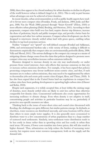 2008), there does appear to be a broad tendency for urban densities to decline in all parts of the world however urban is defined (Angel et al., 2011). This is only in part because urban advantages can now be achieved at lower densities. In recent decades, urban environmentalists as well as public health experts have tended to favour more compact cities (Frumkin, Frank, and Jackson, 2004; Jenks and Burgess, 2000; Van der Waals 2000) pursued through “Smart Growth” (Filion, 2010) or more effective urban planning (Dulal, Brodnig, and Onoriose, 2011). According to their proponents, compact cities build over less land, require shorter trip distances, increase the share of pedestrian, bicycle and public transport trips, and provide a better basis for cogeneration and other low-carbon measures. Compact urban development can also be designed to interweave densely settled urban land with green spaces, enabling urban dwellers to tap local ecosystem services. Neither “compact” nor “sprawl” are well-defined concepts (Frenkel and Ashkenazi, 2008), and environmental burdens take a wide variety of forms, making it difficult to demonstrate empirically that compact cities are environmentally preferable (Batty, 2008; Vella and Morad, 2011). The serious challenge to the compact city concept as a means of mitigating climate change comes from the claim that policies designed to promote more compact cities may nevertheless increase carbon emissions indirectly. Measures designed to increase density in one city may inadvertently—or under pressure from vested interests—have side-effects that increase emissions in that city or increase carbon emissions elsewhere. For example, it has been argued that policies promoting compactness may favour inefficient mono-centric cities, and that, if such measures are to reduce carbon emissions, they may need to be supplemented by others to decentralize jobs and create poly-centric cities (Gaigné, Riou, and Thisse, 2010). It has also been argued that in the United States land use regulations in compact lowcarbon cities have been pushing development to sprawling high-carbon cities (Glaeser and Kahn, 2010). Despite such arguments, it is widely accepted that, at least within the existing range of densities, more densely settled cities are likely to emit less carbon than otherwise comparable low-density cities. Concentrated settlements also create opportunities for increasing resilience to climate change. Even when density is not adaptive in itself, concentrating people and activities in particular locations may be so, particularly if protective area-specific measures are taken. Thinking back to the issues of water-short cities and coastal cities threatened with flooding, the challenges are quite different, but similar patterns emerge. In drylands, as elsewhere, water resources are distributed unevenly, and some locations will be closer than others to more ample water supplies. It is also generally more economical to distribute water to a few concentrations of urban population than to a large number of scattered rural settlements. Similarly, intra-settlement water distribution tends to be less costly in dense rather than in sprawling cities and less costly in urban than rural areas. Of course, if lower costs translate into lower prices, this will also result in higher demand. Thus, urbanization can help reduce the burden of increasing water scarcity, but requires more water resource management, both on the supply and the demand side. 34