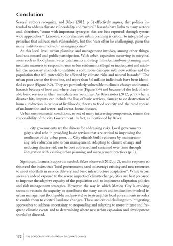Conclusion Several authors recognize, and Baker (2012, p. 3) effectively argues, that policies intended to address climate vulnerability and “natural” hazards have links to many sectors and, therefore, “come with important synergies that are best captured through system wide approaches.” Likewise, comprehensive urban planning is critical to integrated approaches that address such vulnerability, but this “can often be challenging, given the many institutions involved in managing cities”. At this local level, urban planning and management involves, among other things, land-use control and public participation. With urban expansion occurring in marginal areas such as flood plains, water catchments and steep hillsides, land-use planning must institute measures to respond to new urban settlements (illegal or inadequate) and establish the necessary channels to institute a continuous dialogue with new settlers and the population that will potentially be affected by climate risks and natural hazards.17 The urban poor are on the front line, and more than 4.6 million individuals have been identified as poor (Figure 9.2). They are particularly vulnerable to climate change and natural hazards because of how and where they live (Figure 9.4) and because of the lack of reliable basic services in their immediate surroundings. As Baker notes (2012, p. 8), when a disaster hits, impacts can include the loss of basic services, damage to or destruction of homes, reduction in or loss of livelihoods, threats to food security and the rapid spread of malnutrition and water- and vector-borne diseases. Urban environmental conditions, as one of many interacting components, remain the responsibility of the city Government. In fact, as mentioned by Baker: . . . city governments are the drivers for addressing risks. Local governments play a vital role in providing basic services that are critical to improving the resilience of the urban poor. . . . City officials build resilience by mainstreaming risk reduction into urban management. Adapting to climate change and reducing disaster risk can be best addressed and sustained over time through integration with existing urban planning and management practices (p. 2). Significant financial support is needed, Baker observed (2012, p. 2), and in response to this need she insists that “local governments need to leverage existing and new resources to meet shortfalls in service delivery and basic infrastructure adaptation”. While urban areas are indeed exposed to the severe impacts of climate change, cities are best prepared to improve the adaptive capacity of the population and to implement adaptation policies and risk management strategies. However, the way in which Mexico City is evolving seems to restrain the capacity to coordinate the many actors and institutions involved in urban management (both public and private) or to strengthen local governments in order to enable them to control land-use changes. These are critical challenges to integrating approaches to address uncertainty, to responding and adapting to more intense and frequent climatic events and to determining where new urban expansion and development should be directed.