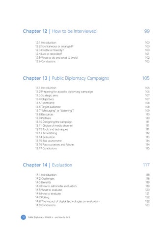 Chapter 13 | Public Diplomacy Campaigns 13.1 Introduction 13.2 Preparing for a public diplomacy campaign 13.3 Strategic aims 13.4 Objectives 13.5 Timeframe 13.6 Target audience 13.7 ÚMessagingÛ or ÚListeningÛ? 13.8 Resources 13.9 Partners 13.10 Designing the campaign 13.11 Choice of media channel 13.12 Tools and techniques 13.13 Timetabling 13.14 Evaluation 13.15 Risk assessment 13.16 Past successes and failures 13.17 Conclusions
