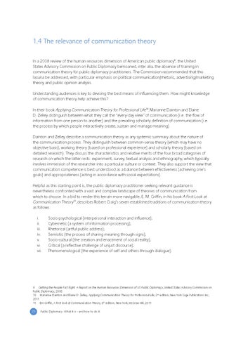 9 Getting the People Part Right: A Report on the Human Resources Dimension of US Public Diplomacy, United States Advisory Commission on Public Diplomacy, 2008. 10 Marianne Dainton and Elaine D. Zelley, Applying Communication Theory for Professional Life, 2nd edition, New York Sage Publications Inc, 2011. 11 Em Grif÷n, A First look at Communication Theory, 8th edition, New York, McGraw Hill, 2011. 20