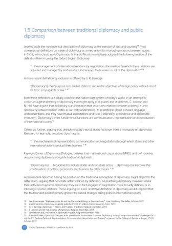 1.5 Comparison between traditional diplomacy and public diplomacy Leaving aside the non-technical description of diplomacy as the exercise of tact and courtesy15, most conventional de÷nitions conceive of diplomacy as a mechanism for managing relations between states. In 1939, in his classic work Diplomacy, Sir Harold Nicolson selectively adopted the following section of the de÷nition then in use by the Oxford English Dictionary:
