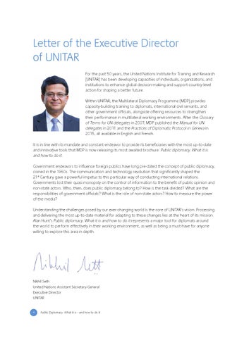 Letter of the Executive Director of UNITAR For the past 50 years, the United Nations Institute for Training and Research (UNITAR) has been developing capacities of individuals, organizations, and institutions to enhance global decision-making and support country-level action for shaping a better future. Within UNITAR, the Multilateral Diplomacy Programme (MDP) provides capacity-building training to diplomats, international civil servants, and other government of÷cials, alongside offering resources to strengthen their performance in multilateral working environments. After the Glossary of Terms for UN delegates in 2007, MDP published the Manual for UN delegates in 2011 and the Practices of Diplomatic Protocol in Geneva in 2015, all available in English and French. It is in line with its mandate and constant endeavor to provide its bene÷ciaries with the most up-to-date and innovative tools that MDP is now releasing its most awaited brochure: Public diplomacy. What it is and how to do it. Government endeavors to inøuence foreign publics have long pre-dated the concept of public diplomacy, coined in the 19 0s. The communication and technology revolution that signi÷cantly shaped the 21st Century gave a powerful impetus to this particular way of conducting international relations. Governments lost their quasi monopoly on the control of information to the bene÷t of public opinion and non-state actors. Who, then, does public diplomacy belong to" How is the task divided" What are the responsibilities of government of÷cials" What is the role of non-state actors" How to measure the power of the media? Understanding the challenges posed by our ever-changing world is the core of UNITARØs vision. Processing and delivering the most up-to-date material for adapting to these changes lies at the heart of its mission. Alan HuntØs Public diplomacy. What it is and how to do it represents a major tool for diplomats around the world to perform effectively in their working environment, as well as being a must-have for anyone willing to explore this area in depth.