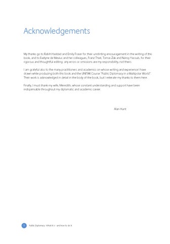 Acknowledgements My thanks go to Rabih Haddad and Emily Fraser for their unstinting encouragement in the writing of this book, and to Evelyne de Mevius and her colleagues, Franz Thiel, Tomas Zak and Nancy Yacoub, for their rigorous and thoughtful editing: any errors or omissions are my responsibility, not theirs. I am grateful also to the many practitioners and academics on whose writing and experience I have drawn while producing both this book and the UNITAR Course ĂšPublic Diplomacy in a Multipolar WorldĂ›. Their work is acknowledged in detail in the body of the book, but I reiterate my thanks to them here. Finally, I must thank my wife, Meredith, whose constant understanding and support have been indispensable throughout my diplomatic and academic career.