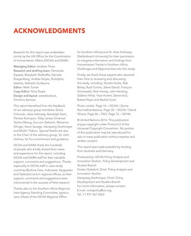 for Southern Africa) and Dr. Ailsa Holloway (Stellenbosch University) for their permission to integrate information and findings from Humanitarian Trends in Southern Africa: Challenges and Opportunities into this study. Finally, we thank those experts who devoted their time to reviewing and discussing the study, including: Sandra Aviles, Rob Bailey, Rudi Coninx, Steve Darvill, François Grünewald, Nick Harvey, John Harding, Debbie Hillier, Yves Horent, Daniel Kull, Robert Piper and Rachel Scott. Photo credits: Page 16 – OCHA / Zarina Nurmukhambetova, Page 32 – OCHA / David Ohana, Page 46 – FAO, Page 72 – OCHA. © United Nations 2014. This publication enjoys copyright under Protocol 2 of the Universal Copyright Convention. No portion of this publication may be reproduced for sale or mass publication without express and written consent. This report was made possible by funding from Australia and Germany. Produced by: OCHA Policy Analysis and Innovation Section, Policy Development and Studies Branch Kirsten Gelsdorf, Chief, Policy Analysis and Innovation Section Hansjoerg Strohmeyer, Chief, Policy Development and Studies Branch For more information, please contact: E-mail: ochapolicy@un.org Tel: +1 917 367 4263