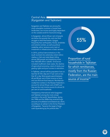 Central Asia (Kyrgyzstan and Tajikistan) Kyrgyzstan and Tajikistan are among the most vulnerable countries in Central Asia: landlocked, low income and highly dependent on the outside world for food and energy. In Kyrgyzstan, almost 40 per cent of people are below the poverty line, and one third struggle to feed themselves. Kyrgyzs frequently face earthquakes, floods, landslides and extreme winters, as well as political instability, ethnic tensions and a lack of investment in infrastructure or basic services. In 2010, political demonstrations in the south evolved into extremely violent ethnic clashes in Osh and Jalal-Abad, killing almost 500 people and displacing more than 400,000 ethnic Uzbeks. Grievances included insufficient clean water, the decline of agricultural economy, a lack of clarity over grazing rights and poor access to education. In Tajikistan, almost half the population lives on less than $1.50 a day and 17 per cent on less than $1 a day. Most people spend between 60 and 80 per cent of their income on food, and one third are food insecure. Remittances– mostly from workers in the Russian Federation– account for almost 50 per cent of GDP, and they are the main income source for almost 55 per cent of rural households.
