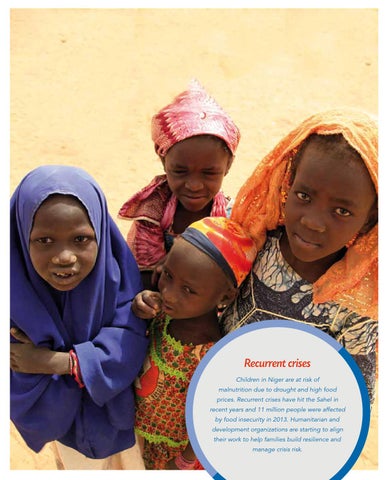 Recurrent crises Children in Niger are at risk of malnutrition due to drought and high food prices. Recurrent crises have hit the Sahel in recent years and 11 million people were affected by food insecurity in 2013. Humanitarian and development organizations are starting to align their work to help families build resilience and manage crisis risk.