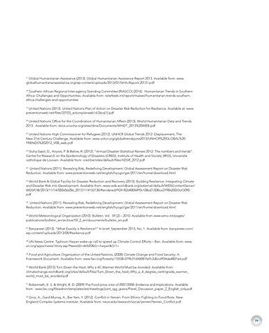 17 Global Humanitarian Assistance (2013). Global Humanitarian Assistance Report 2013. Available from: www. globalhumanitarianassistance.org/wp-content/uploads/2013/07/GHA-Report-20131.pdf 18 Southern African Regional Inter-agency Standing Committee (RIASCO) (2014). Humanitarian Trends in Southern Africa: Challenges and Opportunities. Available from: reliefweb.int/report/malawi/humanitarian-trends-southernafrica-challenges-and-opportunities 19 United Nations (2013). United Nations Plan of Action on Disaster Risk Reduction for Resilience. Available at: www. preventionweb.net/files/33703_actionplanweb14.06cs[1].pdf 20 United Nations Office for the Coordination of Humanitarian Affairs (2013). World Humanitarian Data and Trends 2013. Available from: docs.unocha.org/sites/dms/Documents/WHDT_2013%20WEB.pdf 21 United Nations High Commissioner for Refugees (2012). UNHCR Global Trends 2012: Displacement, The New 21st Century Challenge. Available from: www.unhcr.org/globaltrendsjune2013/UNHCR%20GLOBAL%20 TRENDS%202012_V08_web.pdf 22 Guha-Sapir, D., Hoyois, P. & Below, R. (2012). “Annual Disaster Statistical Review 2012: The numbers and trends”. Centre for Research on the Epidemiology of Disasters (CRED), Institute of Health and Society (IRSS), Université catholique de Louvain. Available from: cred.be/sites/default/files/ADSR_2012.pdf 23 United Nations (2011). Revealing Risk, Redefining Development: Global Assessment Report on Disaster Risk Reduction. Available from: www.preventionweb.net/english/hyogo/gar/2011/en/home/download.html 24 World Bank & Global Facility for Disaster Reduction and Recovery (2013). Building Resilience: Integrating Climate and Disaster Risk into Development. Available from: www-wds.worldbank.org/external/default/WDSContentServer/ WDSP/IB/2013/11/14/000456286_20131114153130/Rendered/PDF/826480WP0v10Bu0130Box37986200OUO090. pdf 25 United Nations (2011). Revealing Risk, Redefining Development: Global Assessment Report on Disaster Risk Reduction. Available from: www.preventionweb.net/english/hyogo/gar/2011/en/home/download.html 26 World Meteorological Organization (2010). Bulletin. Vol. 59 (2) – 2010. Available from www.wmo.int/pages/ publications/bulletin_en/archive/59_2_en/documents/bulletin_en.pdf 27 Banyaneer (2013). “What Exactly is Resilience?” In brief, September 2013, No. 1. Available from: banyaneer.com/ wp-content/uploads/2013/08/Resilience.pdf 28 UN News Centre. Typhoon Haiyan wake-up call to speed up Climate Control Efforts – Ban. Available from: www. un.org/apps/news//story.asp?NewsID=46520&Cr=haiyan&Cr1= 29 Food and Agriculture Organization of the United Nations, (2008) Climate Change and Food Security: A Framework Document. Available from: www.fao.org/forestry/15538-079b31d45081fe9c3dbc6ff34de4807e4.pdf 30 World Bank (2012) Turn Down the Heat: Why a 4C Warmer World Must be Avoided. Available from: climatechange.worldbank.org/sites/default/files/Turn_Down_the_heat_Why_a_4_degree_centrigrade_warmer_ world_must_be_avoided.pdf 31 Bobenrieth, E. S. & Wright, B. D. (2009) The Food price crisis of 2007/2008: Evidence and Implications. Available from: www.fao.org/fileadmin/templates/est/meetings/joint_igg_grains/Panel_Discussion_paper_2_English_only.pdf 32 Gros, A., Gard-Murray, A., Bar-Yam, Y. (2012). Conflict in Yemen: From Ethinic Fighting to Food Riots. New England Complex Systems Institute. Available from: necsi.edu/research/social/yemen/Yemen_Conflict.pdf