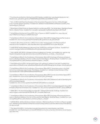 198 Food Security and Nutrition Working Group (2013) Update. Available from: www.disasterriskreduction.net/ fileadmin/user_upload/drought/docs/FSNWG%20Update%20October%2020131114.pdf 199 Slim, H. (2012). IASC Real-Time Evaluation of the Humanitarian Response to the Horn of Africa Drought Crisis in Somalia, Ethiopia and Kenya. Available from: reliefweb.int/sites/reliefweb.int/files/resources/RTE_HoA_ SynthesisReport_FINAL.pdf 200 World Bank & Global Facility for Disaster Reduction and Recovery (2012). The Sendai Report. Managing Disaster Risk for a Resilient Future. Available from: www.gfdrr.org/sites/gfdrr.org/files/Sendai_Report_051012.pdf 201 United Nations Development Group (2010). How to Prepare an UNDAF. Available from: www.undg.org/ docs/11096/How-to-Prepare-an-UNDAF-(Part-I).pdf 202 United Nations Office for the Coordination of Humanitarian Affairs (2013). Strategic Response Plan Guidance. Available from: docs.unocha.org/sites/dms/CAP/2014_SRP_guidance-27_Sep_2013_EN.pdf 203 Anderson, M. B., Brown, D, & Jean, I. (2012). Time to Listen: Hearing people on the Receiving End of International Aid. Available from: www.cdacollaborative.org/media/60478/Time-to-Listen-Book.pdf 204 USAID (2012). Building Resilience to Recurrent Crisis: USAID Policy and Program Guidance. Available from: transition.usaid.gov/resilience/USAIDResiliencePolicyGuidanceDocument.pdf 205 FAO, UNICEF, WFP (2012). A Strategy for Enhancing Resilience in Somalia. July. Available from: www.fao.org/ fileadmin/templates/cfs_high_level_forum/documents/Brief-Resilience-_JointStrat_-_Final_Draft.pdf. 206 United Nations Office for the Coordination of Humanitarian Affairs (2013). Exchange of Practices and Lessons Learnt on Resilience Building in the Horn of Africa and the Sahel Regions. Workshop Report. Available from: www. urd.org/IMG/pdf/Horn_Sahel_Resilience_Workshop_Report_-_final.pdf 207 Sahel Working Group (2011). Escaping the hunger cycle: pathways to resilience in the Sahel. Available from: www.e-alliance.ch/fileadmin/user_upload/docs/Publications/Food/2012/Escaping_the_Hunger_Cycle_English.pdf 208 United Nations Office for the Coordination of Humanitarian Affairs (2013). Humanitarian actors in the Sahel start work on a three-year response plan. Press Release. Available from: reliefweb.int/sites/reliefweb.int/files/ resources/2013.28.11%20-%20Press%20release%20HNO.pdf 209 United Nations Office for the Coordination of Humanitarian Affairs (2012). Somalia Consolidated Appeal 20132015. Available from: docs.unocha.org/sites/dms/CAP/CAP_2013_Somalia.pdf 210 United Nations Office for the Coordination of Humanitarian Affairs (2012). Reference Guide for Developing the 2013 Consolidated Appeals. Available from: docs.unocha.org/sites/dms/CAP/CAP_2013_Reference_Guide.pdf 211 United Nations Office for the Coordination of Humanitarian Affairs (2010). Consolidated Appeal for Kenya 2011+ Emergency Response Humanitarian Plan. Available from: docs.unocha.org/sites/dms/CAP/2011_Kenya_EHRP.pdf 212 DARA (2011). The Humanitarian Response Index 2011. Addressing the Gender Challenge. Available from: daraint.org/wp-content/uploads/2012/03/HRI_2011_Complete_Report.pdf 213 United Nations Office for the Coordination of Humanitarian Affairs (2013). Exchange of Practices and Lessons Learnt on Resilience Building in the Horn of Africa and the Sahel Regions. Workshop Report. Available from: www. urd.org/IMG/pdf/Horn_Sahel_Resilience_Workshop_Report_-_final.pdf 214 OXFAM (2012). Building Resilience in Eastern Indonesia – Effectiveness Review. Full Technical Report. Available from: reliefweb.int/sites/reliefweb.int/files/resources/er-building-resilience-indonesia-effectiveness-review-081012full-report-en.pdf 215 The Jakarta Post (2013). Communities can protect themselves from natural disasters, says Oxfam. Available from: www.thejakartapost.com/news/2013/03/24/communities-can-protect-themselves-natural-disasterssays-oxfam.html