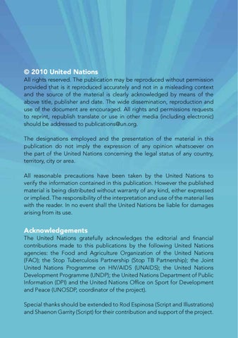 Acknowledgements The United Nations gratefully acknowledges the editorial and financial contributions made to this publications by the following United Nations agencies: the Food and Agriculture Organization of the United Nations (FAO); the Stop Tuberculosis Partnership (Stop TB Partnership); the Joint United Nations Programme on HIV/AIDS (UNAIDS); the United Nations Development Programme (UNDP); the United Nations Department of Public Information (DPI) and the United Nations Office on Sport for Development and Peace (UNOSDP, coordinator of the project). Special thanks should be extended to Rod Espinosa (Script and Illustrations) and Shaenon Garrity (Script) for their contribution and support of the project. 2