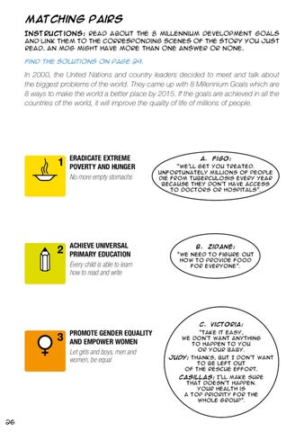 Matching Pairs Instructions: Read about the 8 Millennium Development Goals and link them to the corresponding scenes of the story you just read. An MDG might have more than one answer or none. Find the solutions on page 29.