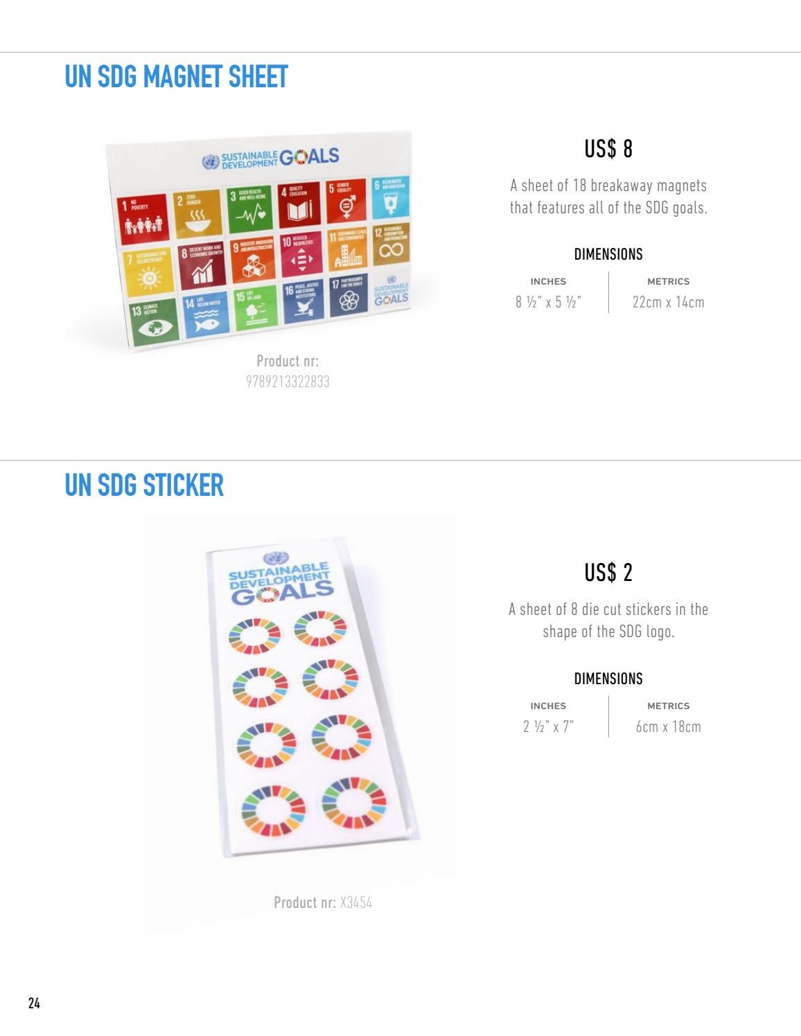 UN SDG STICKER US$ 2 A sheet of 8 die cut stickers in the shape of the SDG logo. DIMENSIONS