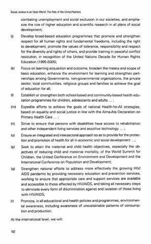combating unemployment and social exclusion in our societies, and emphasize the role of higher education and scientific research in all plans of social development; Develop broad-based education programmes that promote and strengthen respect for all human rights and fundamental freedoms, including the right to development, promote the values of tolerance, responsibility and respect for the diversity and rights of others, and provide training in peaceful conflict resolution, in recognition of the United Nations Decade for Human Rights Education (1995-2005); Focus on learning acquisition and outcome, broaden the means and scope of basic education, enhance the environment for learning and strengthen partnerships among Governments, non-governmental organizations, the private sector, local communities, religious groups and families to achieve the goal of education for all; Establish or strengthen both school-based and community-based health education programmes for children, adolescents and adults ... ; Expedite efforts to achieve the goals of national Health-for-All strategies, based on equality and social justice in line with the Alma-Ata Declaration on Primary Health Care ... ; Strive to ensure that persons with disabilities have access to rehabilitation and other independent living services and assistive technology . .. ; Ensure an integrated and intersectoral approach so as to provide for the protection and promotion of health for all in economic and social development . ..; Seek to attain the maternal and child health objectives, especially the objectives of reducing child and maternal mortality, of the World Summit for Children, the United Conference on Environment and Development and the International Conference on Population and Development; Strengthen national efforts to address more effectively the growing HIV/ AIDS pandemic by providing necessary education and prevention services, working to ensure that appropriate care and support services are available and accessible to those affected by HIVIAIDS, and taking all necessary steps to eliminate every form of discrimination against and isolation of those living with HIVIAIDS; Promote, in all educational and health policies and programmes, environmental awareness, including awareness of unsustainable patterns of consumption and production. At the international level, we will: 102