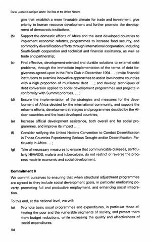 gies that establish a more favorable climate for trade and investment, give priority to human resource development and further promote the development of democratic institutions; Support the domestic efforts of Africa and the least developed countries to implement economic reforms, programmes to increase food security, and commodity diversification efforts through international cooperation, including South-South cooperation and technical and financial assistance, as well as trade and partnership; Find effective, development-oriented and durable solutions to external debt problems, through the immediate implementation of the terms of debt forgiveness agreed upon in the Paris Club in December 1994 ... ; invite financial institutions to examine innovative approaches to assist low-income countries with a high proportion of multilateral debt ... ; and develop techniques of debt conversion applied to social development programmes and projects in conformity with Summit priorities. ... ; Ensure the implementation of the strategies and measures for the development of Africa decided by the international community, and support the reforms efforts, development strategies and programmes decided by the African countries and the least developed countries; Increase official development assistance, both overall and for social programmes, and improve its impact ... ; Consider ratifying the United Nations Convention to Combat Desertification in Those Countries Experiencing Serious Drought andlor Desertification, Particularly in Africa ... ; Take all necessary measures to ensure that communicable diseases, particularly HIV/AIDS, malaria and tuberculosis, do not restrict or reverse the progress made in economic and social development. Commitment 8 We commit ourselves to ensuring that when structural adjustment programmes are agreed to they include social development goals, in particular eradicating poverty, promoting full and productive employment, and enhancing social integration.