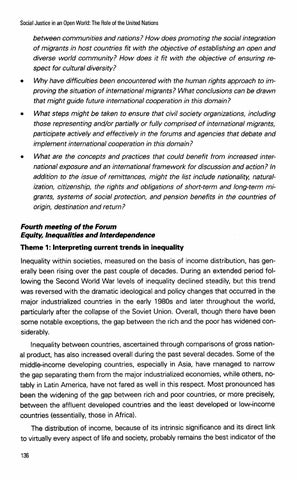 Fourth meeting of the Forum Equity, Inequalities and Interdependence Theme 1: Interpreting current trends in inequality Inequality within societies, measured on the basis of income distribution, has generally been rising over the past couple of decades. During an extended period following the Second World War levels of inequality declined steadily, but this trend was reversed with the dramatic ideological and policy changes that occurred in the major industrialized countries in the early 1980s and later throughout the world, particularly after the collapse of the Soviet Union. Overall, though there have been some notable exceptions, the gap between the rich and the poor has widened considerably. Inequality between countries, ascertained through comparisons of gross national product, has also increased overall during the past several decades. Some of the middle-income developing countries, especially in Asia, have managed to narrow the gap separating them from the major industrialized economies, while others, notably in Latin America, have not fared as well in this respect. Most pronounced has been the widening of the gap between rich and poor countries, or more precisely, between the affluent developed countries and the least developed or low-income countries (essentially, those in Africa). The distribution of income, because of its intrinsic significance and its direct link to virtually every aspect of life and society, probably remains the best indicator of the