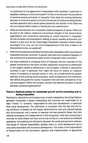 or justification for the aggravation of inequalities within societies, in particular inequalities relating to income and wealth? Is there a link between the prevalence of extreme poverty and levels of inequality? How does the existing dichotomy between an economic sphere (currently the domain of those promoting the laissez-faire approach) and a social sphere (presently the domain of the State and the civil society) affect matters of distribution and redistribution? What are the elements of a universally shared conception of equity? What can be said of the relative intellectual and political strength of the Governments, organizations and movements advocating an overall reduction in inequality? Do the principles and prescriptions relating to equity, equality and poverty contained in a text such as the Copenhagen Declaration represent shared values and ideals? If so, how can the virtual disappearance of this text, at least in official political circles, be explained? Whatare the analytical and political links between inequalities within countries and inequalities between countries? Is greater openness and increased integration in the world economy generating higher levels of inequality within countries? Are there traditional or emerging forms of inequality that are important for the people concerned but that have not been adequately recognized or addressed? Is this neglect related to deficiencies in the concepts, methods or approaches currently in use? In particular, how might the focus on results, on measurements of conditions at discrete points in time, be complemented by greater attention to the evolving social processes, social arrangements and institutions that define and guide the course of people's lives and their perceptions of equity and inequity? Within this context, should more attention be given to equity between successive generations?