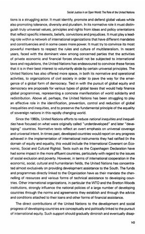tions is a struggling actor. it must identify, promote and defend global values while also promoting tolerance, diversity and pluralism. In its normative role it must distinguish truly universal values, principles and rights from ideas and policy orientations that reflect specific interests, beliefs, convictions and prejudices. It must play a leading role within a network of international organizations that have different mandates and constituencies and in some cases more power. It must try to convince its most powerful members to respect the rules and culture of multilateralism. In recent years, faced with the dominant view among concerned parties that the activities of private economic and financial forces should not be subjected to international laws and regulations, the United Nations has endeavoured to convince these forces that it is in their best interest to voluntarily abide by certain universal principles. The United Nations has also offered more space, in both its normative and operational activities, to organizations of civil society in order to pave the way for the emergence of a global form of democracy. Tied in with the pursuit of global equity and democracy are proposals for various types of global taxes that would help finance global programmes, representing a concrete manifestation of world solidarity and redistribution. Above all, perhaps, the United Nations has been struggling to play an effective role in the identification, prevention, control and reduction of global inequalities and inequities, and to preserve the fundamental principle of the equality of sovereign nations in this rapidly changing world. Since the 1960s, United Nations efforts to reduce national inequities and inequalities have focused on what were originally called "underdeveloped" and later "developing" countries. Normative texts reflect an overt emphasis on universal coverage and universal intent. In times past, developed countries would report on any progress achieved in the implementation of international instruments they had ratified (in the domain of equity and equality, this would include the International Covenant on Economic, Social and Cultural Rights). Texts such as the Copenhagen Declaration have had some impact in the more affluent countries, particularly with regard to the issues of social exclusion and poverty. However, in terms of international cooperation in the economic, social, cultural and humanitarian fields, the United Nations has concentrated almost exclusively on providing development assistance to the South. The funds and programmes directly linked to the Organization have as their mandate the channelling of resources and various forms of technical assistance to developing countries. Other international organizations, in particular the W O and the Bretton Woods institutions, strongly influence the national policies of a large number of developing countries through the norms and agreements they establish and through the advice and conditions attached to their loans and other forms of financial assistance. The direct contributions of the United Nations to the development and social progress of developing countries are conceptually and politically linked to the pursuit of international equity. Such support should gradually diminish and eventually disap-