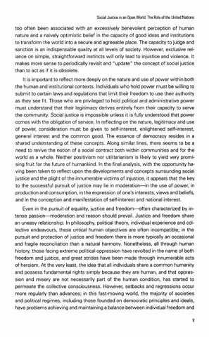 too often been associated with an excessively benevolent perception of human nature and a naively optimistic belief in the capacity of good ideas and institutions to transform the world into a secure and agreeable place. The capacity to judge and sanction is an indispensable quality at all levels of society. However, exclusive reliance on simple, straightforward instincts will only lead to injustice and violence. It makes more sense to periodically revisit and "update" the concept of social justice than to act as if it is obsolete. It is important to reflect more deeply on the nature and use of power within both the human and institutional contexts. Individuals who hold power must be willing to submit to certain laws and regulations that limit their freedom to use their authority as they see fit. Those who are privileged to hold political and administrative power must understand that their legitimacy derives entirely from their capacity to serve the community. Social justice is impossible unless it is fully understood that power comes with the obligation of service. In reflecting on the nature, legitimacy and use of power, consideration must be given to self-interest, enlightened self-interest, general interest and the common good. The essence of democracy resides in a shared understanding of these concepts. Along similar lines, there seems to be a need to revive the notion of a social contract both within communities and for the world as a whole. Neither positivism nor utilitarianism is likely to yield very promising fruit for the future of humankind. In the final analysis, with the opportunity having been taken to reflect upon the developments and concepts surrounding social justice and the plight of the innumerable victims of injustice, it appears that the key to the successful pursuit of justice may lie in moderation-in the use of power, in production and consumption, in the expression of one's interests, views and beliefs, and in the conception and manifestation of self-interest and national interest. Even in the pursuit of equality, justice and freedom-often characterized by intense passion-moderation and reason should prevail. Justice and freedom share an uneasy relationship. In philosophy, political theory, individual experience and collective endeavours, these critical human objectives are often incompatible; in the pursuit and protection of justice and freedom there is more typically an occasional and fragile reconciliation than a natural harmony. Nonetheless, all through human history, those facing extreme political oppression have revolted in the name of both freedom and justice, and great strides have been made through innumerable acts of heroism. At the very least, the idea that all individuals share a common humanity and possess fundamental rights simply because they are human, and that oppression and misery are not necessarily part of the human condition, has started to permeate the collective consciousness. However, setbacks and regressions occur more regularly than advances; in this fast-moving world, the majority of societies and political regimes, including those founded on democratic principles and ideals, have problems achieving and maintaining a balance between individual freedom and