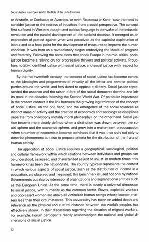 or Aristotle, or Confucius or Averroes, or even Rousseau or Kant-saw the need to consider justice or the redress of injustices from a social perspective. The concept first surfaced in Western thought and political language in the wake of the industrial revolution and the parallel development of the socialist doctrine. It emerged as an expression of protest against what was perceived as the capitalist exploitation of labour and as a focal point for the development of measures to improve the human condition. It was born as a revolutionary slogan embodying the ideals of progress and fraternity. Following the revolutions that shook Europe in the mid-1800s, social justice became a rallying cry for progressive thinkers and political activists. Proudhon, notably, identified justice with social justice, and social justice with respect for human dignity. By the mid-twentieth century, the concept of social justice had become central to the ideologies and programmes of virtually all the leftist and centrist political parties around the world, and few dared to oppose it directly. Social justice represented the essence and the raison dr$tre of the social democrat doctrine and left its mark in the decades following the Second World War. Of particular importance in the present context is the link between the growing legitimization of the concept of social justice, on the one hand, and the emergence of the social sciences as distinct areas of activity and the creation of economics and sociology as disciplines separate from philosophy (notably moral philosophy), on the other hand. Social justice became more clearly defined when a distinction was drawn between the social sphere and the economic sphere, and grew into a mainstream preoccupation when a number of economists became convinced that it was their duty not only to describe phenomena but also to propose criteria for the distribution of the fruits of human activity. The application of social justice requires a geographical, sociological, political and cultural framework within which relations between individuals and groups can be understood, assessed, and characterized as just or unjust. In modern times, this framework has been the nation-State. The country typically represents the context in which various aspects of social justice, such as the distribution of income in a population, are observed and measured; this benchmark is used not only by national Governments but also by international organizations and supranational entities such as the European Union. At the same time, there is clearly a universal dimension to social justice, with humanity as the common factor. Slaves, exploited workers and oppressed women are above all victimized human beings whose location matters less than their circumstances. This universality has taken on added depth and relevance as the physical and cultural distance between the world's peoples has effectively shrunk. In their discussions regarding the situation of migrant workers, for example, Forum participants readily acknowledged the national and global dimensions of social justice.