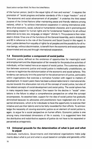 1.4 Economic justice: a component of social justice Economic justice, defined as the existence of opportunities for meaningful work and employment and the dispensation of fair rewards for the productive activities of individuals, will be treated here as an aspect of social justice. The customary distinction between economic justice and social justice is intellectually unsatisfactory, as it serves to legitimize the dichotomization of the economic and social spheres. This tendency can seriously limit the potential for the advancement of justice, particularly within organizations that exercise a normative function with regard to matters of development. In recent years there has been a discernable trend in internationaldiscourse towards the attenuation not only of the concept of social justice, but also of the related concepts of social development and social policy. The social sphere has in many respects been marginalized. One reason for the decline in "social" orientations is the failure to adopt a comprehensive perspective on what the concept encompasses. As asserted later, support for the idea of social justice has gradually diminished because its advocates and practitioners have neglected one of its essential dimensions, which is for individuals to have the opportunity to exercise their initiative and use their talents and to be fairly rewarded for their efforts. To acknowledge the necessity of viewing economic justice as an element of social justice is, again, to argue for a social perspective on human affairs. Economic justice is one among many interrelated dimensions of life in society. It is suggested here that the distributive and redistributive aspects of justice do not have to be separated or perceived as antagonistic.