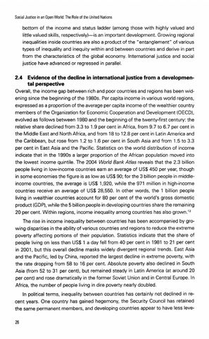 2.4 Evidence of the decline in international justice from a developmental perspective Overall, the income gap between rich and poor countries and regions has been widening since the beginning of the 1980s. Per capita income in various world regions, expressed as a proportion of the average per capita income of the wealthier country members of the Organization for Economic Cooperation and Development (OECD), evolved as follows between 1980 and the beginning of the twenty-first century: the relative share declined from 3.3 to 1.9 per cent in Africa, from 9.7 to 6.7 per cent in the Middle East and North Africa, and from 18 to 12.8 per cent in Latin America and the Caribbean, but rose from 1.2 to 1.6 per cent in South Asia and from 1.5 to 3.3 per cent in East Asia and the Pacific. Statistics on the world distribution of income indicate that in the 1990s a larger proportion of the African population moved into the lowest income quintile. The 2004 World Bank Atlas reveals that the 2.3 billion people living in low-income countries earn an average of US$450 per year, though in some economies the figure is as low as US$90; for the 3 billion people in middleincome countries, the average is US$ 1,920, while the 971 million in high-income countries receive an average of US$ 28,550. In other words, the 1 billion people living in wealthier countries account for 80 per cent of the world's gross domestic product (GDP), while the 5 billion people in developing countries share the remaining 20 per cent. Within regions, income inequality among countries has also grown.I2 The rise in income inequality between countries has been accompanied by growing disparities in the ability of various countries and regions to reduce the extreme poverty affecting portions of their population. Statistics indicate that the share of people living on less than US$ 1 a day fell from 40 per cent in 1981 to 21 per cent in 2001, but this overall decline masks widely divergent regional trends. East Asia and the Pacific, led by China, reported the largest decline in extreme poverty, with the rate dropping from 58 to 16 per cent. Absolute poverty also declined in South Asia (from 52 to 31 per cent), but remained steady in Latin America (at around 20 per cent) and rose dramatically in the former Soviet Union and in Central Europe. In Africa, the number of people living in dire poverty nearly doubled. In political terms, inequality between countries has certainly not declined in recent years. One country has gained hegemony, the Security Council has retained the same permanent members, and developing countries appear to have less leve-