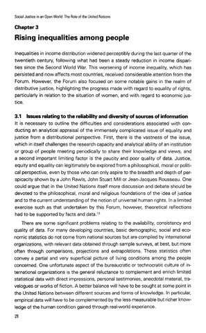 3.1 Issues relating to the reliability and diversity of sources of information It is necessary to outline the difficulties and considerations associated with conducting an analytical appraisal of the immensely complicated issue of equality and justice from a distributional perspective. First, there is the vastness of the issue, which in itself challenges the research capacity and analytical ability of an institution or group of people meeting periodically to share their knowledge and views, and a second important limiting factor is the paucity and poor quality of data. Justice, equity and equality can legitimately be explored from a philosophical, moral or political perspective, even by those who can only aspire to the breadth and depth of perspicacity shown by a John Rawls, John Stuart Mill or Jean-Jacques Rousseau. One could argue that in the United Nations itself more discussion and debate should be devoted to the philosophical, moral and religious foundations of the idea of justice and to the current understandingof the notion of universal human rights. In a limited exercise such as that undertaken by this Forum, however, theoretical reflections had to be supported by facts and data.13 There are some significant problems relating to the availability, consistency and quality of data. For many developing countries, basic demographic, social and economic statistics do not come from national sources but are compiled by international organizations, with relevant data obtained through sample surveys, at best, but more often through comparisons, projections and extrapolations. These statistics often convey a partial and very superficial picture of living conditions among the people concerned. One unfortunate aspect of the bureaucratic or technocratic culture of international organizations is the general reluctance to complement and enrich limited statistical data with direct impressions, personal testimonies, anecdotal material, travelogues or works of fiction. A better balance will have to be sought at some point in the United Nations between different sources and forms of knowledge. In particular, empirical data will have to be complemented by the less measurable but richer knowledge of the human condition gained through real-world experience.