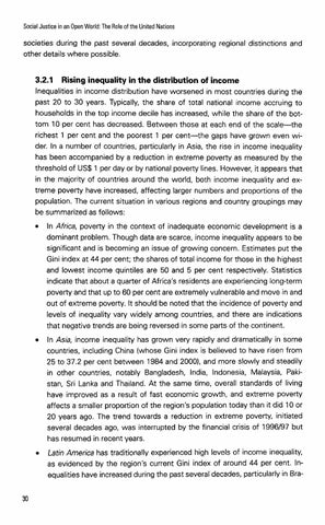 3.2.1 Rising inequality in the distribution of income Inequalities in income distribution have worsened in most countries during the past 20 to 30 years. Typically, the share of total national income accruing to households in the top income decile has increased, while the share of the bottom 10 per cent has decreased. Between those at each end of the scale-the richest 1 per cent and the poorest 1 per cent-the gaps have grown even wider. In a number of countries, particularly in Asia, the rise in income inequality has been accompanied by a reduction in extreme poverty as measured by the threshold of US$1 per day or by national poverty lines. However, it appears that in the majority of countries around the world, both income inequality and extreme poverty have increased, affecting larger numbers and proportions of the population. The current situation in various regions and country groupings may be summarized as follows: In Africa, poverty in the context of inadequate economic development is a dominant problem. Though data are scarce, income inequality appears to be significant and is becoming an issue of growing concern. Estimates put the Gini index at 44 per cent; the shares of total income for those in the highest and lowest income quintiles are 50 and 5 per cent respectively. Statistics indicate that about a quarter of Africa's residents are experiencing long-term poverty and that up to 60 per cent are extremely vulnerable and move in and out of extreme poverty. It should be noted that the incidence of poverty and levels of inequality vary widely among countries, and there are indications that negative trends are being reversed in some parts of the continent. In Asia, income inequality has grown very rapidly and dramatically in some countries, including China (whose Gini index is believed to have risen from 25 to 37.2 per cent between 1984 and 20001, and more slowly and steadily in other countries, notably Bangladesh, India, Indonesia, Malaysia, Pakistan, Sri Lanka and Thailand. At the same time, overall standards of living have improved as a result of fast economic growth, and extreme poverty affects a smaller proportion of the region's population today than it did 10 or 20 years ago. The trend towards a reduction in extreme poverty, initiated several decades ago, was interrupted by the financial crisis of 1996/97 but has resumed in recent years. Lath America has traditionally experienced high levels of income inequality, as evidenced by the region's current Gini index of around 44 per cent. Inequalities have increased during the past several decades, particularly in Bra-