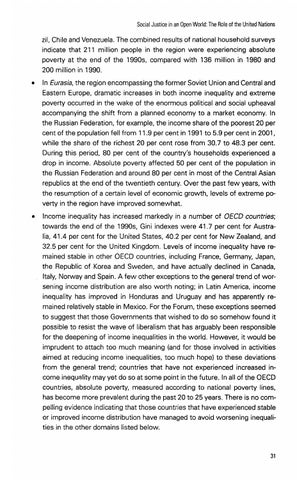 zil, Chile and Venezuela. The combined results of national household surveys indicate that 21 1 million people in the region were experiencing absolute poverty at the end of the 1990s, compared with 136 million in 1980 and 200 million in 1990. In Eurasia, the region encompassing the former Soviet Union and Central and Eastern Europe, dramatic increases in both income inequality and extreme poverty occurred in the wake of the enormous political and social upheaval accompanying the shift from a planned economy to a market economy. In the Russian Federation, for example, the income share of the poorest 20 per cent of the population fell from 11.9 per cent in 1991 to 5.9 per cent in 2001, while the share of the richest 20 per cent rose from 30.7 to 48.3 per cent. During this period, 80 per cent of the country's households experienced a drop in income. Absolute poverty affected 50 per cent of the population in the Russian Federation and around 80 per cent in most of the Central Asian republics at the end of the twentieth century. Over the past few years, with the resumption of a certain level of economic growth, levels of extreme poverty in the region have improved somewhat. Income inequality has increased markedly in a number of OECD countries; towards the end of the 1990s, Gini indexes were 41.7 per cent for Australia, 41.4 per cent for the United States, 40.2 per cent for New Zealand, and 32.5 per cent for the United Kingdom. Levels of income inequality have remained stable in other OECD countries, including France, Germany, Japan, the Republic of Korea and Sweden, and have actually declined in Canada, Italy, Norway and Spain. A few other exceptions to the general trend of worsening income distribution are also worth noting; in Latin America, income inequality has improved in Honduras and Uruguay and has apparently remained relatively stable in Mexico. For the Forum, these exceptions seemed to suggest that those Governments that wished to do so somehow found it possible to resist the wave of liberalism that has arguably been responsible for the deepening of income inequalities in the world. However, it would be imprudent to attach too much meaning (and for those involved in activities aimed at reducing income inequalities, too much hope) to these deviations from the general trend; countries that have not experienced increased income inequality may yet do so at some point in the future. In all of the OECD countries, absolute poverty, measured according to national poverty lines, has become more prevalent during the past 20 to 25 years. There is no compelling evidence indicating that those countries that have experienced stable or improved income distribution have managed to avoid worsening inequalities in the other domains listed below.