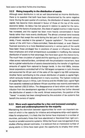 3.2.2 Rising inequality in the distribution of assets Although asset distribution is not as well documented as income distribution, there is no question that both have been characterized by the same negative trend. During the past quarter of a century, the distribution of assets, especially capital, has become more skewed in favour of those at the top of the socioeconomic ladder. As labour has lost ground in relation to capital for the remuneration of the factors of production, the share of capital income in total income has increased, and this capital has been more heavily concentrated in fewer hands rather than more evenly distributed. The almost universal trend towards privatization that swept the world during the last part of the twentieth century rarely, if ever, resulted in the spread of "popular capitalism". The main beneficiaries of the shift from a State-controlled, State-dominated, or even State-influenced economy to a more liberalized economy in various parts of the world have been those privileged few in positions of power or influence. Nowhere have employees and small entrepreneurs succeeded in modifying the national distribution of assets to their advantage; few have been given the chance to try. The much freer circulation of capital and the opening up of investment opportunities across national borders, combined with the privatization movement, have led to a global redistribution of assets characterized by the transfer of significant amounts of capital from national to foreign hands. In the mid-1990s, transnational corporations controlled half of the 100 largest companies in Latin America and accounted for 43 per cent of the sales of the region's top 500 companies. Another factor contributing to the uneven distribution of assets is capital flight, which seriously hinders development in many countries. The highest incidence of capital flight occurs in Africa, Latin America and the Middle East; capital flight from severely indebted sub-Saharan African countries was recently estimated to have reached US$ 22 billion. The disappearance of land reform and land redistribution from the development agendas of most countries has further skewed the distribution of assets in the world. Almost everywhere, the position of the "havesf' in society has been strengthened by the evolution of tax systems that benefit the owners of capital.