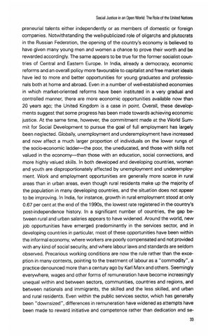 Social Justice in an Open World: The Role of the United Nations preneurial talents either independently or as members of domestic or foreign companies. Notwithstanding the well-publicized role of oligarchs and plutocrats in the Russian Federation, the opening of the country's economy is believed to have given many young men and women a chance to prove their worth and be rewarded accordingly. The same appears to be true for the former socialist countries of Central and Eastern Europe. In India, already a democracy, economic reforms and an overall policy more favourable to capitalist and free market ideals have led to more and better opportunities for young graduates and professionals both at home and abroad. Even in a number of well-established economies in which market-oriented reforms have been instituted in a very gradual and controlled manner, there are more economic opportunities available now than 20 years ago; the United Kingdom is a case in point. Overall, these developments suggest that some progress has been made towards achieving economic justice. At the same time, however, the commitment made at the World Summit for Social Development to pursue the goal of full employment has largely been neglected. Globally, unemployment and underemployment have increased and now affect a much larger proportion of individuals on the lower rungs of the socio-economic ladder-the poor, the uneducated, and those with skills not valued in the economy-than those with an education, social connections, and more highly valued skills. In both developed and developing countries, women and youth are disproportionately affected by unemployment and underemployment. Work and employment opportunities are generally more scarce in rural areas than in urban areas, even though rural residents make up the majority of the population in many developing countries, and the situation does not appear to be improving. In India, for instance, growth in rural employment stood at only 0.67 per cent at the end of the 1990s, the lowest rate registered in the country's post-independence history. In a significant number of countries, the gap between rural and urban salaries appears to have widened. Around the world, new job opportunities have emerged predominantly in the services sector, and in developing countries in particular, most of these opportunities have been within the informal economy, where workers are poorly compensated and not provided with any kind of social security, and where labour laws and standards are seldom observed. Precarious working conditions are now the rule rather than the exception in many contexts, pointing to the treatment of labour as a "commodity", a practice denounced more than a century ago by Karl Marx and others. Seemingly everywhere, wages and other forms of remuneration have become increasingly unequal within and between sectors, communities, countries and regions, and between nationals and immigrants, the skilled and the less skilled, and urban and rural residents. Even within the public services sector, which has generally been "downsized", differences in remuneration have widened as attempts have been made to reward initiative and competence rather than dedication and se-