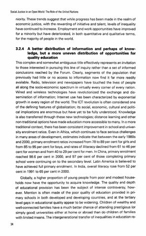 3.2.4 A better distribution of information and perhaps of knowledge, but a more uneven distribution of opportunities for quality education This complex and somewhat ambiguous title effectively represents an invitation to those interested in pursuing this line of inquiry rather than a set of informed conclusions reached by the Forum. Clearly, segments of the population that previously had little or no access to information now find it far more readily available. Radio, television and newspapers have touched the lives of people all along the socio-economic spectrum in virtually every corner of every nation. Wired and wireless technologies have revolutionized the exchange and dissemination of information; lnternet use has been characterized by exponential growth in every region of the world. The ICT revolution is often considered one of the defining features of globalization; its social, economic, cultural and political implications are enormous but have yet to be fully understood. Knowledge is also transferred through these new technologies; distance learning and other non-traditionaloptions have made education more accessible to many. In a more traditional context, there has been consistent improvement in school and university enrolment ratios. Even in Africa, which continues to face serious challenges in many areas of development, estimates indicate that between the early 1980s and 2000, primary enrolment ratios increased from 78 to 89 per cent for girls and from 85 to 95 per cent for boys, and rates of illiteracy declined from 61 to 46 per cent for women and from 40 to 29 per cent for men. In China, primary enrolment reached 98.6 per cent in 2000, and 97 per cent of those completing primary school were continuing on to the secondary level. Latin America is believed to have achieved full primary enrolment. In India, overall literacy rose from 52 per cent in 1991 to 65 per cent in 2000. Globally, a higher proportion of young people from poor and modest households now have the opportunity to acquire knowledge. The quality and depth of educational provision has been the subject of intense controversy, however. Mention is often made of the poor quality of education provided in primary schools in both developed and developing countries, and at the tertiary level gaps in educational quality appear to be widening. Children of wealthy and well-connected families have a much better chance of attending prestigious (or simply good) universities either at home or abroad than do children of families with limited means. The intergenerational transfer of inequalities in education re-
