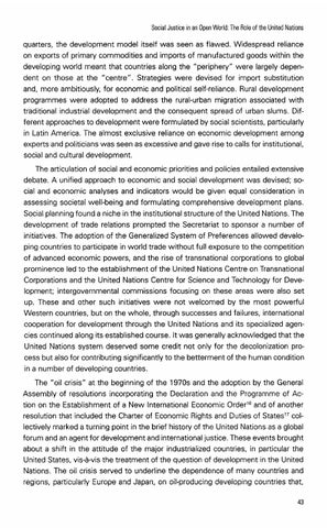 quarters, the development model itself was seen as flawed. Widespread reliance on exports of primary commodities and imports of manufactured goods within the developing world meant that countries along the "periphery" were largely dependent on those at the "centre". Strategies were devised for import substitution and, more ambitiously, for economic and political self-reliance. Rural development programmes were adopted to address the rural-urban migration associated with traditional industrial development and the consequent spread of urban slums. Different approaches to development were formulated by social scientists, particularly in Latin America. The almost exclusive reliance on economic development among experts and politicians was seen as excessive and gave rise to calls for institutional, social and cultural development. The articulation of social and economic priorities and policies entailed extensive debate. A unified approach to economic and social development was devised; social and economic analyses and indicators would be given equal consideration in assessing societal well-being and formulating comprehensive development plans. Social planning found a niche in the institutional structure of the United Nations. The development of trade relations prompted the Secretariat to sponsor a number of initiatives. The adoption of the Generalized System of Preferences allowed developing countries to participate in world trade without full exposure to the competition of advanced economic powers, and the rise of transnational corporations to global prominence led to the establishment of the United Nations Centre on Transnational Corporations and the United Nations Centre for Science and Technology for Development; intergovernmental commissions focusing on these areas were also set up. These and other such initiatives were not welcomed by the most powerful Western countries, but on the whole, through successes and failures, international cooperation for development through the United Nations and its specialized agencies continued along its established course. It was generally acknowledged that the United Nations system deserved some credit not only for the decolonization process but also for contributing significantly to the betterment of the human condition in a number of developing countries. The "oil crisis" at the beginning of the 1970s and the adoption by the General Assembly of resolutions incorporating the Declaration and the Programme of Action on the Establishment of a New International Economic Order16and of another resolution that included the Charter of Economic Rights and Duties of Statest7collectively marked a turning point in the brief history of the United Nations as a global forum and an agent for development and internationaljustice. These events brought about a shift in the attitude of the major industrialized countries, in particular the United States, vis-a-vis the treatment of the question of development in the United Nations. The oil crisis served to underline the dependence of many countries and regions, particularly Europe and Japan, on oil-producing developing countries that,