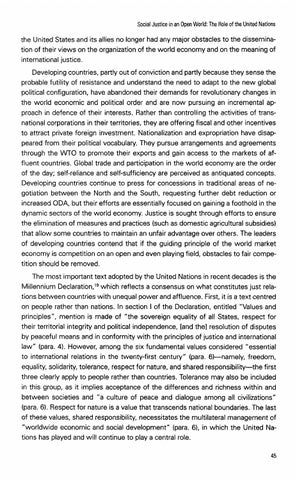 the United States and its allies no longer had any major obstacles to the dissemination of their views on the organization of the world economy and on the meaning of international justice. Developing countries, partly out of conviction and partly because they sense the probable futility of resistance and understand the need to adapt to the new global political configuration, have abandoned their demands for revolutionary changes in the world economic and political order and are now pursuing an incremental approach in defence of their interests. Rather than controlling the activities of transnational corporations in their territories, they are offering fiscal and other incentives to attract private foreign investment. Nationalization and expropriation have disappeared from their political vocabulary. They pursue arrangements and agreements through the WTO to promote their exports and gain access to the markets of affluent countries. Global trade and participation in the world economy are the order of the day; self-reliance and self-sufficiency are perceived as antiquated concepts. Developing countries continue to press for concessions in traditional areas of negotiation between the North and the South, requesting further debt reduction or increased ODA, but their efforts are essentially focused on gaining a foothold in the dynamic sectors of the world economy. Justice is sought through efforts to ensure the elimination of measures and practices (such as domestic agricultural subsidies) that allow some countries to maintain an unfair advantage over others. The leaders of developing countries contend that if the guiding principle of the world market economy is competition on an open and even playing field, obstacles to fair competition should be removed. The most important text adopted by the United Nations in recent decades is the Millennium Declaration,lgwhich reflects a consensus on what constitutes just relations between countries with unequal power and affluence. First, it is a text centred an people rather than nations. In section l of the Declaration, entitled "Values and principles", mention is made of "the sovereign equality of all States, respect for their territorial integrity and political independence, [and the1 resolution of disputes by peaceful means and in conformity with the principles of justice and international law" (para. 4). However, among the six fundamental values considered "essential to international relations in the twenty-first century" (para. 6)-namely, freedom, equality, solidarity, tolerance, respect for nature, anti shared responsibility-the first three clearly apply to people rather than countries. Tolerance may also be included in this group, as it implies acceptance of the differences and richness within and between societies and "a culture of peace and dialogue among all civilizations" (para. 6). Respect for nature is a value that transcends national boundaries. The last of these values, shared responsibility, necessitates the multilateral management of "worldwide economic anti social development" (para. 61, in which the United Nations has played and will continue to play a central role.