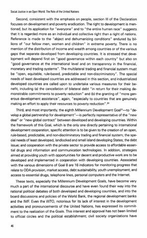 Second, consistent with the emphasis on people, section Ill of the Declaration focuses on development and poverty eradication. The right to development is mentioned, but its application for "everyone" and to "the entire human race" suggests that it is regarded more as an individual and collective right than a right of nations. Reference is made to the "abject and dehumanizing conditions" endured by billions of "our fellow men, women and children" in extreme poverty. There is no mention of the distribution of income and wealth among countries or of the various gaps that separate developed from developing countries. It is stressed that development will depend first on "good governance within each country" but also on "good governance at the international level and on transparency in the financial, monetary and trading systems". The multilateral trading and financial system must be "open, equitable, rule-based, predictable and non-discriminatory". The special needs of least developed countries are addressed in this section, and industrialized developed countries are called upon to undertake various measures for their benefit, including (a) the cancellation of bilateral debt "in return for their making demonstrable commitments to poverty reduction" and (b) the granting of "more generous development assistance", again, "especially to countries that are genuinely making an effort to apply their resources to poverty r e d u ~ t i o n " . ~ ~ Third, and most importantly, the eighth Millennium Development G~al*~--to"develop a global partnership for developmentM-is perfectly representative of the "new deal" or "new global contract" between developed and developing countries. Within the framework of this Goal, which is the only one directly pertaining to international development cooperation, specific attention is to be given to the creation of an open, rule-based, predictable, and non-discriminatorytrading and financial system; the special needs of least developed, landlocked and small island developing States; the debt issue; and cooperation with the private sector to provide access to affordable essential drugs and information and communication technologies. In addition, strategies aimed at providing youth with opportunities for decent and productive work are to be developed and implemented in cooperation with developing countries. Associated with the various dimensions of Goal 8 are 16 indicators for monitoring progress that relate to ODA provision, market access, debt sustainability, youth unemployment, and access to essential drugs, telephone lines, personal computers and the Internet. These texts, especially the Millennium Development Goals, have become very much a part of the international discourse and have even found their way into the national political debates of both developed and developing countries, and into the board discussions and policies of the World Bank, the regional development banks and the IMF. Even the WTO, notorious for its lack of interest in the development activities and pronouncements of the United Nations, has expressed its commitment to the realization of the Goals. This interest and approval has not been limited to official circles and the political establishment; civil society organizations have