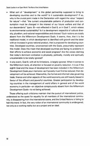 What sort of "development" is this global partnership supposed to bring to developing countries and to the world? Is it sustainable development? If so, why is the crucial point made in the Declaration with regard the value "respect for natureu-that "the current unsustainable patterns of production and consumption must be changed in the interest of our future welfare and that of our descendants" (para. 6)-not reflected in Goal 8, or in Goal 7, which relates to environmental sustainability? Is it a development respectful of cultural diversity, pluralism, and national responsibilities and choices? Such notions are totally absent from the Millennium Development Goals. It seems, then, that it is the traditional model, in which development is identified with growth and the latter with an increase in gross national product, that is proposed for developing countries. Developed countries, unconcerned with the Goals, presumably represent this model. Does this mean that developed countries are facing no problems in their efforts to achieve economic and social progress? Are the voices claiming that today's dominant civilization is physically, politically, morally and spiritually unsustainable to be totally ignored? In any event, Goal 8, with all its limitations, is largely ignored. When it comes to the Millennium texts, all attention is focused on poverty reduction. It is as if the eighth Goal and the issue of development has been included in the Millennium Development Goals pour memoire-as if poverty must first be reduced, then development will be achieved. Meanwhile, the formal and informal rules governing trade, finance and other aspects of the world economy are still heavily biased in favour of the affluent and powerful countries. Greater participation by developing countries in the management of world affairs in general and of the world economy in particular-an objective conspicuously absent from the Millennium Development Goals-is not being achieved. Those offering such criticisms maintain that the pursuit of international justice, understood as the quest for equality for all members of the international community, is disappearing from the international scene, and the United Nations is failing to halt this trend. In fact, the very notion of an international community is endangered, not only as a working reality but as a project and an ideal.