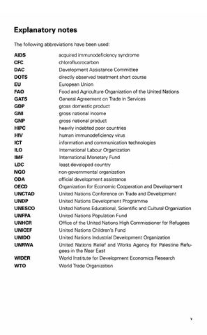Explanatory notes The following abbreviations have been used: acquired immunodeficiency syndrome chlorofluorocarbon Development Assistance Committee directly observed treatment short course European Union Food and Agriculture Organization of the United Nations General Agreement on Trade in Services gross domestic product gross national income grass nationai product heavily indebted poor countries human immunodeficiency virus information and communication technologies International Labour Organization lnternational Monetary Fund least developed country non-governmental organization official development assistance Organizatiori for Economic Cooperation and Development United Nations Conference on Trade and Development United Nations Development Programme United Nations Educational, Scientific and Cultural Organization United Nations Population Fund Office of the United Nations High Commissioner for Refugees United Nations Children's Fund United Nations Industrial Development Organization United Nations Relief and Works Agency for Palestine Refugees in the Near East World Institute for Development Economics Research World Trade Organization