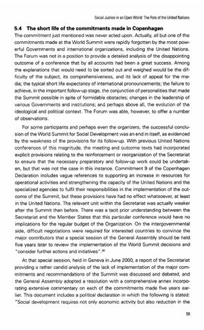 5.4 The short life of the commitments made in Copenhagen The commitment just mentioned was never acted upon. Actually, all but one of the commitments made at the World Summit were rapidly forgotten by the most powerful Governments and international organizations, including the United Nations. The Forum was not in a position to provide a detailed analysis of the disappointing outcome of a conference that by all accounts had been a great success. Among the explanations that would need to be sorted out and weighed would be the difficulty of the subject, its comprehensiveness, and its lack of appeal for the media; the typical short life expectancy of international pronouncements; the failure to achieve, in the important follow-up stage, the conjunction of personalitiesthat made the Summit possible in spite of formidable obstacles; changes in the leadership of various Governments and institutions; and perhaps above all, the evolution of the ideological and political context. The Forum was able, however, to offer a number of observations. For some participants and perhaps even the organizers, the successful conclusion of the World Summit for Social Development was an end in itself, as evidenced by the weakness of the provisions for its follow-up. With previous United Nations conferences of this magnitude, the meeting and outcome texts had incorporated explicit provisions relating to the reinforcement or reorganization of the Secretariat to ensure that the necessary preparatory and follow-up work could be undertaken, but that was not the case in this instance. Commitment 9 of the Copenhagen Declaration includes vague references to supporting an increase in resources for operational activities and strengthening the capacity of the United Nations and the specialized agencies to fulfil their responsibilities in the implementation of the outcome of the Summit, but these provisions have had no effect whatsoever, at least in the United Nations. The relevant unit within the Secretariat was actually weaker after the Summit than before. There was a tacit prior understanding between the Secretariat and the Member States that this particular conference would have no implications for the regular budget of the Organization. On the intergovernmental side, difficult negotiations were required for interested countries to convince the major contributors that a special session of the General Assembly should be held five years later to review the implementation of the World Summit decisions and "consider further actions and initiatives" .30 At that special session, held in Geneva in June 2000, a report of the Secretariat providing a rather candid analysis of the lack of implementation of the major commitments and recommendations of the Summit was discussed and debated, and the General Assembly adopted a resolution with a comprehensive annex incorporating extensive commentary on each of the commitments made five years earlier. This document includes a political declaration in which the following is stated: "Social development requires not only economic activity but also reduction in the