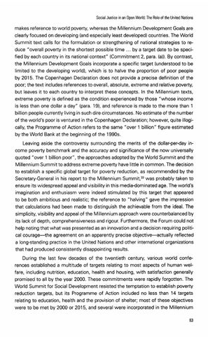 makes reference to world poverty, whereas the Millennium Development Goals are clearly focused on developing (and especially least developed) countries. The World Summit text calls for the formulation or strengthening of national strategies to reduce "overall poverty in the shortest possible time ... by a target date to be specified by each country in its national context" (Commitment 2, para. (a)).By contrast, the Millennium Development Goals incorporate a specific target (understood to be limited to the developing world), which is to halve the proportion of poor people by 2015. The Copenhagen Declaration does not provide a precise definition of the poor; the text includes references to overall, absolute, extreme and relative poverty, but leaves it to each country to interpret these concepts. In the Millennium texts, extreme poverty is defined as the condition experienced by those "whose income is less than one dollar a day" (para. 191, and reference is made to the more than 1 billion people currently living in such dire circumstances. No estimate of the number of the world's poor is ventured in the Copenhagen Declaration; however, quite illogically, the Programme of Action refers to the same "over 1 billion" figure estimated by the World Bank at the beginning of the 1990s. Leaving aside the controversy surrounding the merits of the dollar-per-day income poverty benchmark and the accuracy and significance of the now universally quoted "over 1 billion poor", the approaches adopted by the World Summit and the Millennium Summit to address extreme poverty have little in common. The decision to establish a specific global target for poverty reduction, as recommended by the Secretary-General in his report to the Millennium Summit,33was probably taken to ensure its widespread appeal and visibility in this media-dominated age. The world's imagination and enthusiasm were indeed stimulated by this target that appeared to be both ambitious and realistic; the reference to "halving" gave the impression that calculations had been made to distinguish the achievable from the ideal. The simplicity, visibility and appeal of the Millennium approach were counterbalanced by its lack of depth, comprehensivenessand rigour. Furthermore, the Forum could not help noting that what was presented as an innovation and a decision requiring political courage-the agreement on an apparently precise objective-actually reflected a long-standing practice in the United Nations and other international organizations that had produced consistently disappointing results. During the last few decades of the twentieth century, various world conferences established a multitude of targets relating to most aspects of human welfare, including nutrition, education, health and housing, with satisfaction generally promised to all by the year 2000. These commitments were rapidly forgotten. The World Summit for Social Development resisted the temptation to establish poverty reduction targets, but its Programme of Action included no less than 14 targets relating to education, health and the provision of shelter; most of these objectives were to be met by 2000 or 2015, and several were incorporated in the Millennium
