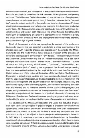 tween women and men, and the creation of a favourable international environment. Particular emphasis is placed on the link between full employment and poverty reduction. The Millennium Declaration makes no specific mention of employment, unemploymerlt or underemployment, though there is a reference in the "secondtier" commitments of section Ill to the development and implementation of "strategies that give young people everywhere a real chance to find decent and productive work" (para. 20); this constitutes a specific target under the eighth Millennium Development Goal and has not been neglected. The United Nations, the ILO and the World Bank are collaborating on a project to address this issue. While this is a start, the critical issue of productive work and employment requires far more attention, particularly in this age of global markets. Much of the present analysis has focused on the content of the conference texts under review; it is also essential to undertake a critical examination of the choices made with regard to language and expression in these texts. The Millennium texts take the reader from a rather elevated evocation of the principles of equity and social justice to a sequence of "dry" targets. The introductory section of the Millennium Declaration not only lists six "fundamental values" but is also rich in concepts and expressions such as "shared future", "common humanity", "culture of peace and dialogue among all civilizations", "prudence", "responsibility", and "equity and social justice", evoking the language of the Summit and proceeding from the same political philosophy that inspired the authors of the Charter of the United Nations and of the Universal Declaration of Human Rights. The Millennium Declaration is actually more readable and more consistently elegant and inspiring than the Copenhagen Declaration, as it was subjected to much less negotiation. The section on development and poverty eradication, for example, includes only one reference to equity (within the trading system), one reference to equality (between men and women), and no reference to social justice, but in its first paragraph, the simple, straightforward commitment to "freeing the entire human race from want" essentially encapsulates all the dimensions of justice for humanity. Conversely, the Millennium Development Goals and the accompanying targets and indicators are articulated in the sober, non-philosophical language of economists and statisticians. For advocates of the Millennium Declaration and Goals, this deductive progression from values and principles to precise targets is precisely how international agreements, which are not treaties but are nonetheless more than a catalogue of good intentions, should be structured. Is there a better way to express the commitment to equity and social justice than to pledge to reduce poverty in the world by half? Why is it necessary to produce a long text characterized by the endless repetition of values and principles that are very general and on which there is, in any case, universal agreement? If there is no consensus on the understanding and practical implications of some of these values and principles, what purpose is served