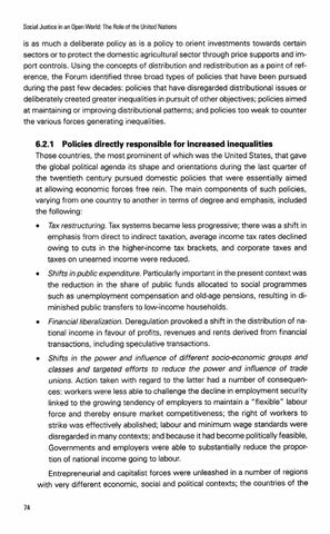 6.2.1 Policies directly responsible for increased inequalities Those countries, the most prominent of which was the United States, that gave the global political agenda its shape and orientations during the last quarter of the twentieth century pursued domestic policies that were essentially aimed at allowing economic forces free rein. The main components of such policies, varying from one country to another in terms of degree and emphasis, included the following: Tax restructuring. Tax systems became less progressive; there was a shift in emphasis from direct to indirect taxation, average income tax rates declined owing to cuts in the higher-income tax brackets, and corporate taxes and taxes on unearned income were reduced. Shifts in public expenditure. Particularly important in the present context was the reduction in the share of public funds allocated to social programmes such as unemployment compensation and old-age pensions, resulting in diminished public transfers to low-income households. Financial liberalization. Deregulation provoked a shift in the distribution of national income in favour of profits, revenues and rents derived from financial transactions, including speculative transactions. Shifts in the power and influence of different socio-economic groups and classes and targeted efforts to reduce the power and influence of trade unions. Action taken with regard to the latter had a number of consequences: workers were less able to challenge the decline in employment security linked to the growing tendency of employers to maintain a "flexible" labour force and thereby ensure market competitiveness; the right of workers to strike was effectively abolished; labour and minimum wage standards were disregarded in many contexts; and because it had become politically feasible, Governments and employers were able to substantially reduce the proportion of national income going to labour. Entrepreneurial and capitalist forces were unleashed in a number of regions with very different economic, social and political contexts; the countries of the