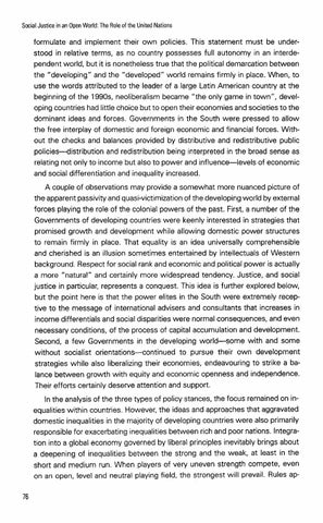 A couple of observations may provide a somewhat more nuanced picture of the apparent passivity and quasi-victimization of the developing world by external forces playing the role of the colonial powers of the past. First, a number of the Governments of developing countries were keenly interested in strategies that promised growth and development while allowing domestic power structures to remain firmly in place. That equality is an idea universally comprehensible and cherished is an illusion sometimes entertained by intellectuals of Western background. Respect for social rank and economic and political power is actually a more "natural" and certainly more widespread tendency. Justice, and social justice in particular, represents a conquest. This idea is further explored below, but the point here is that the power elites in the South were extremely receptive to the message of international advisers and consultants that increases in income differentials and social disparities were normal consequences, and even necessary conditions, of the process of capital accumulation and development. Second, a few Governments in the developing world-some with and some without socialist orientations-continued to pursue their own development strategies while also liberalizing their economies, endeavouring to strike a balance between growth with equity and economic openness and independence. Their efforts certainly deserve attention and support. In the analysis of the three types of policy stances, the focus remained on inequalities within countries. However, the ideas and approaches that aggravated domestic inequalities in the majority of developing countries were also primarily responsible for exacerbating inequalities between rich and poor nations. Integration into a global economy governed by liberal principles inevitably brings about a deepening of inequalities between the strong and the weak, at least in the short and medium run. When players of very uneven strength compete, even on an open, level and neutral playing field, the strongest will prevail. Rules ap-