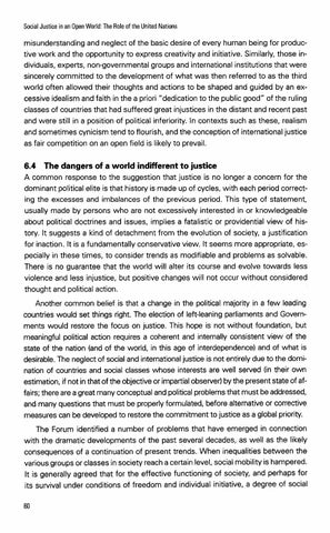 6.4 The dangers of a world indifferent to justice A common response to the suggestion that justice is no longer a concern for the dominant political elite is that history is made up of cycles, with each period correcting the excesses and imbalances of the previous period. This type of statement, usually made by persons who are not excessively interested in or knowledgeable about political doctrines and issues, implies a fatalistic or providential view of history. It suggests a kind of detachment from the evolution of society, a justification for inaction. It is a fundamentally conservative view. It seems more appropriate, especially in these times, to consider trends as modifiable and problems as solvable. There is no guarantee that the world will alter its course and evolve towards less violence and less injustice, but positive changes will not occur without considered thought and political action. Another common belief is that a change in the political majority in a few leading countries would set things right. The election of left-leaning parliaments and Governments would restore the focus on justice. This hope is not without foundation, but meaningful political action requires a coherent and internally consistent view of the state of the nation (and of the world, in this age of interdependence) and of what is desirable. The neglect of social and international justice is not entirely due to the domination of countries and social classes whose interests are well served (in their own estimation, if not in that of the objective or impartial observer) by the present state of affairs; there are a great many conceptual and political problems that must be addressed, and many questions that must be properly formulated, before alternative or corrective measures can be developed to restore the commitment to justice as a global priority. The Forum identified a number of problems that have emerged in connection with the dramatic developments of the past several decades, as well as the likely consequences of a continuation of present trends. When inequalities between the various groups or classes in society reach a certain level, social mobility is hampered. It is generally agreed that for the effective functioning of society, and perhaps for its survival under conditions of freedom and individual initiative, a degree of social